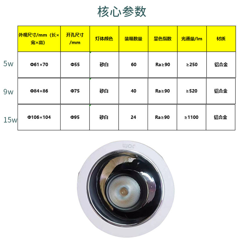 功率 | 5W 55-960K/36°亮黑 | | 功率 | 9W75-930K/15°亮黑 |