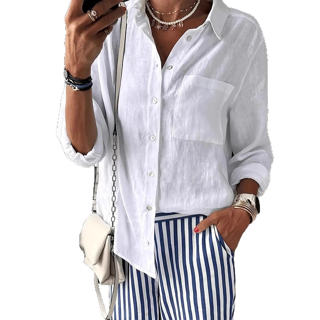 25独立站wish亚马逊爆款 秋季简约纯色挽袖V领纽扣翻领衬衣女