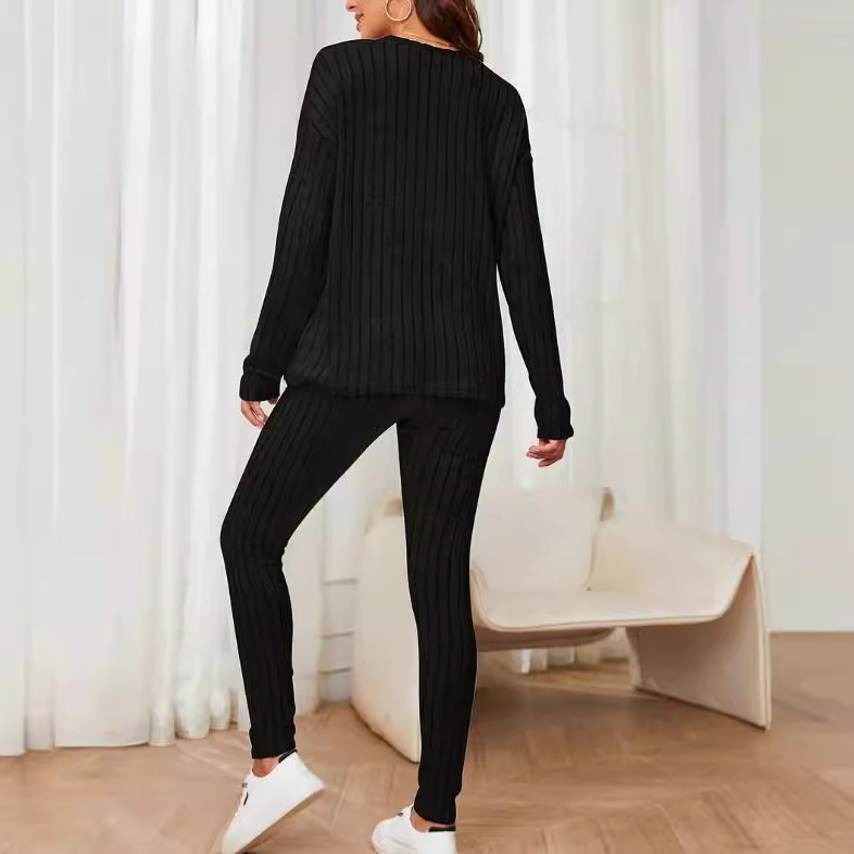 2025欧美跨境两件套女秋季新款时尚休闲气质宽松圆领坑条针织套装