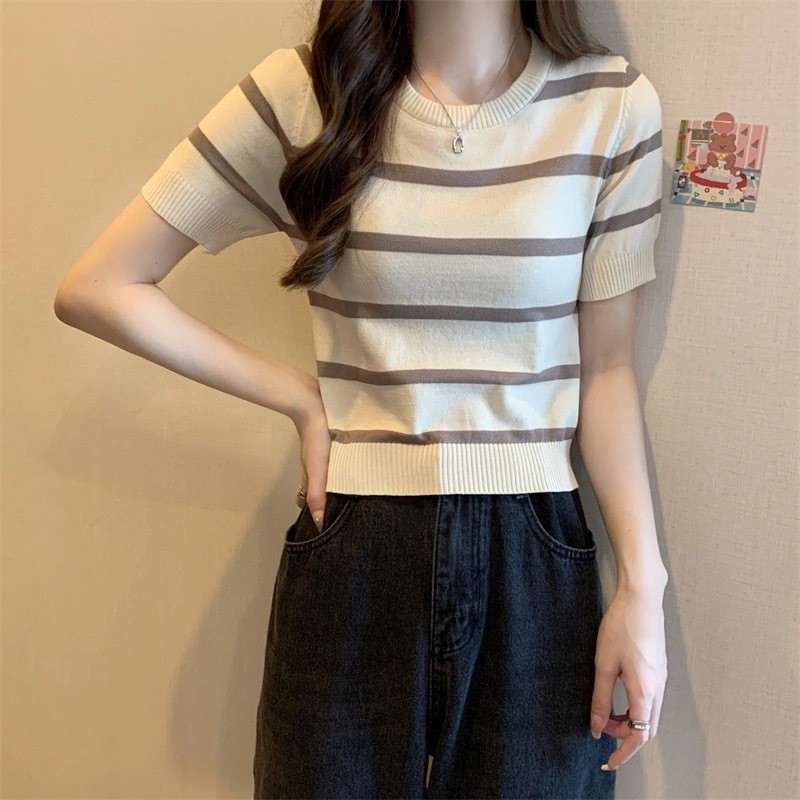 新款撞色条纹短款上衣女夏季薄款修身显瘦正肩套头针织衫T恤休闲