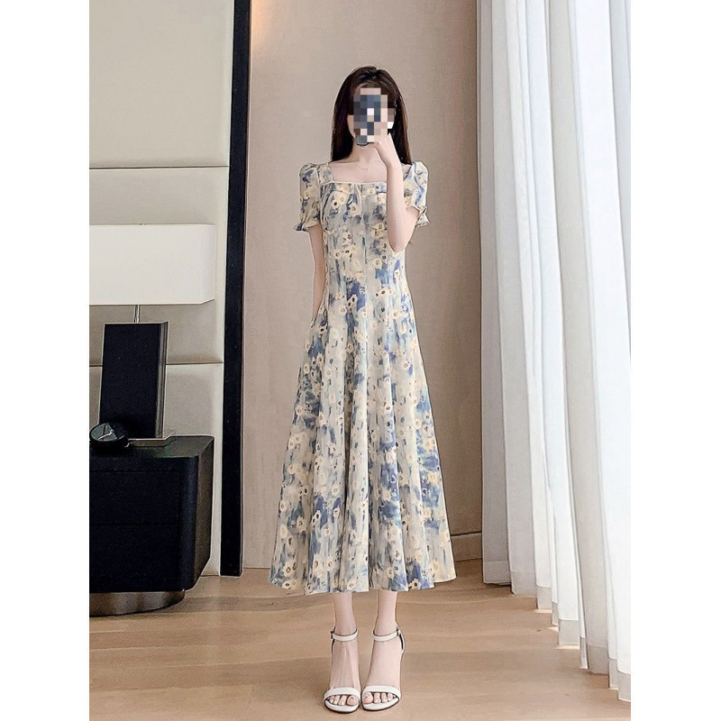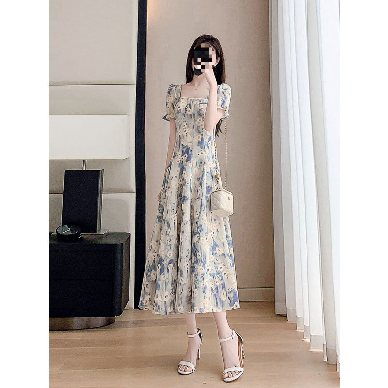 【人收藏】法式方领蓝色雪纺碎花连衣裙女夏季新款高