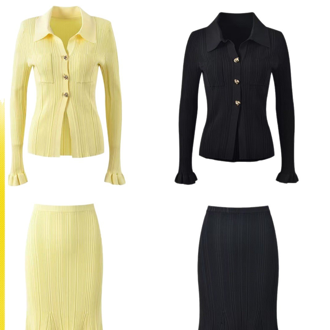 元品质 2025早秋法式甜美减龄奶黄修身翻领针织衫开衫+半身裙套装