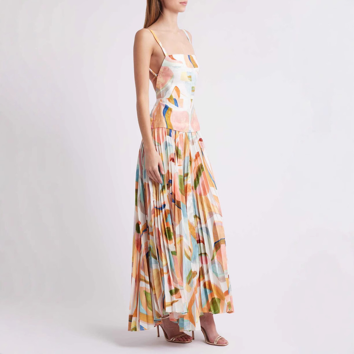 2025跨境欧美夏季印花女连衣裙无袖细肩带褶皱休闲连衣裙舒适休闲