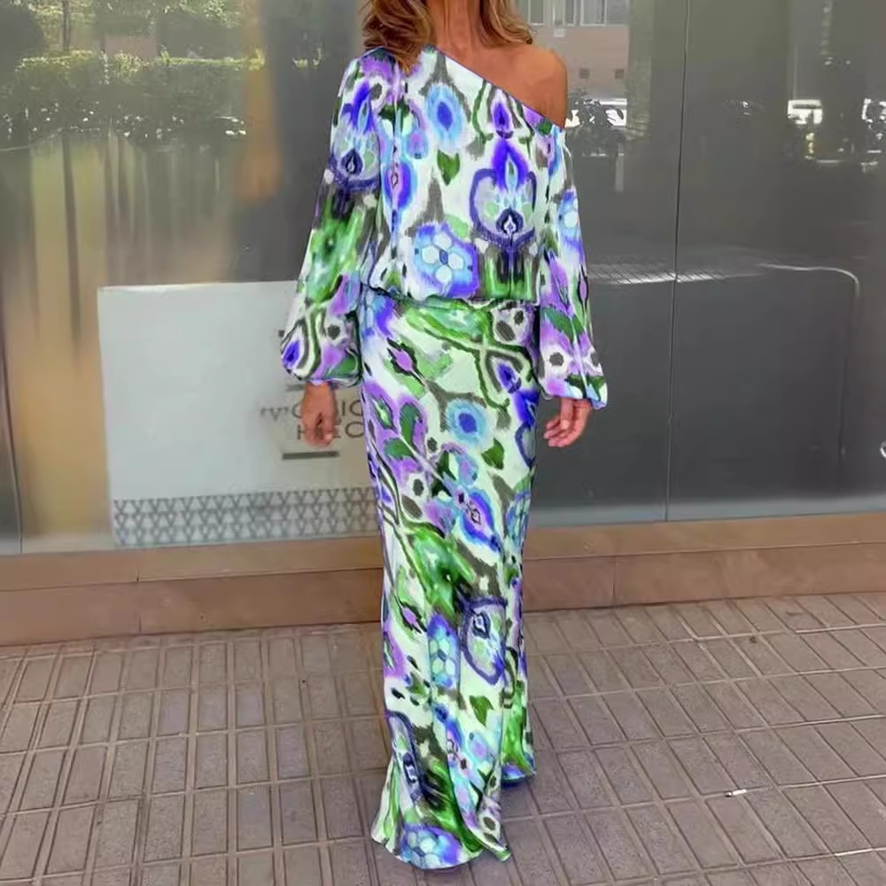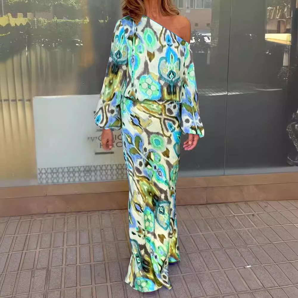 2022跨境欧美女装秋季新款宽松印花长袖露肩上衣半身鱼尾长裙套装