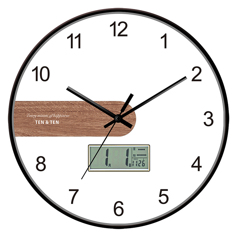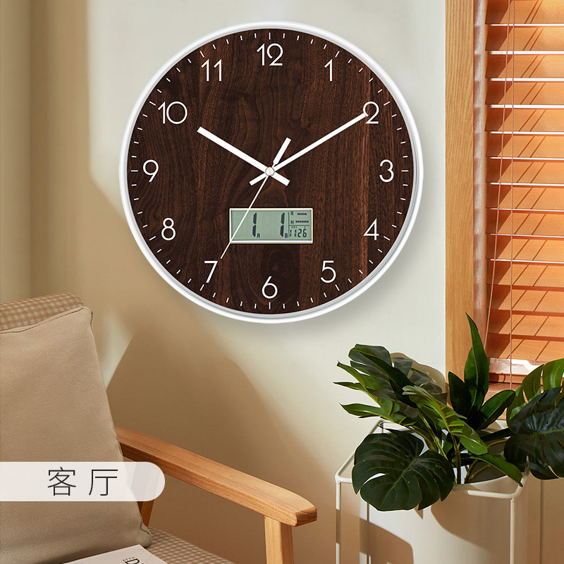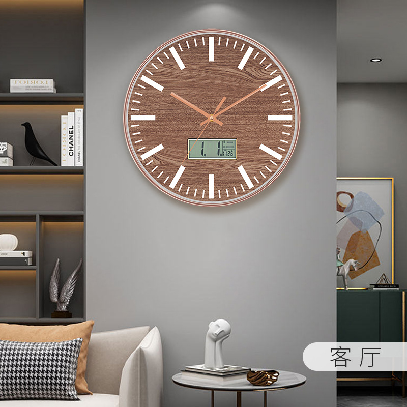 仿木纹家用创意装饰北欧简约大气日历显示挂墙时钟客厅卧室挂钟表