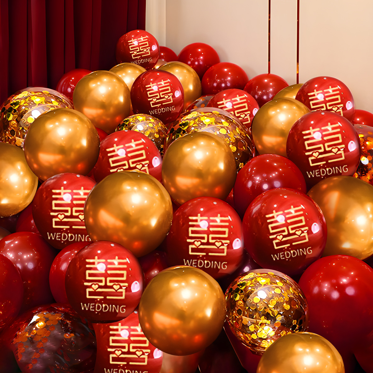 尺寸 | 石榴红50个+金亮片10个【52】 | 尺寸 | 宝石红气球20个【55】 |