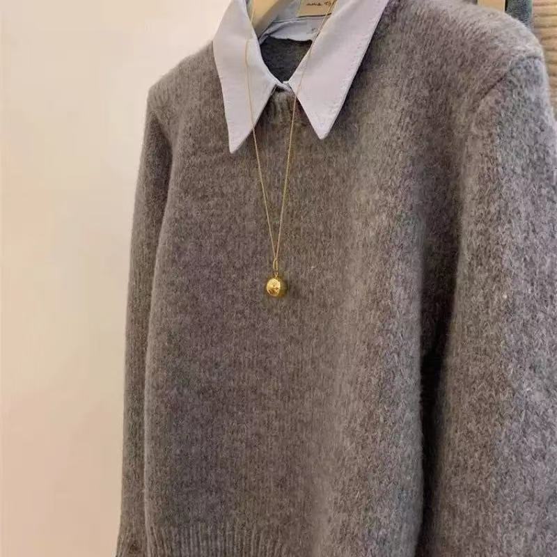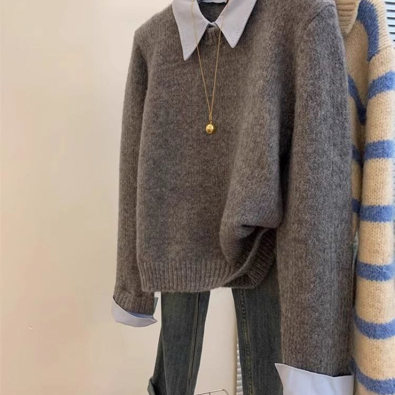 2025假两件衬衫polo套头慵懒风打底翻领灰色宽松针织衫加长款拼色