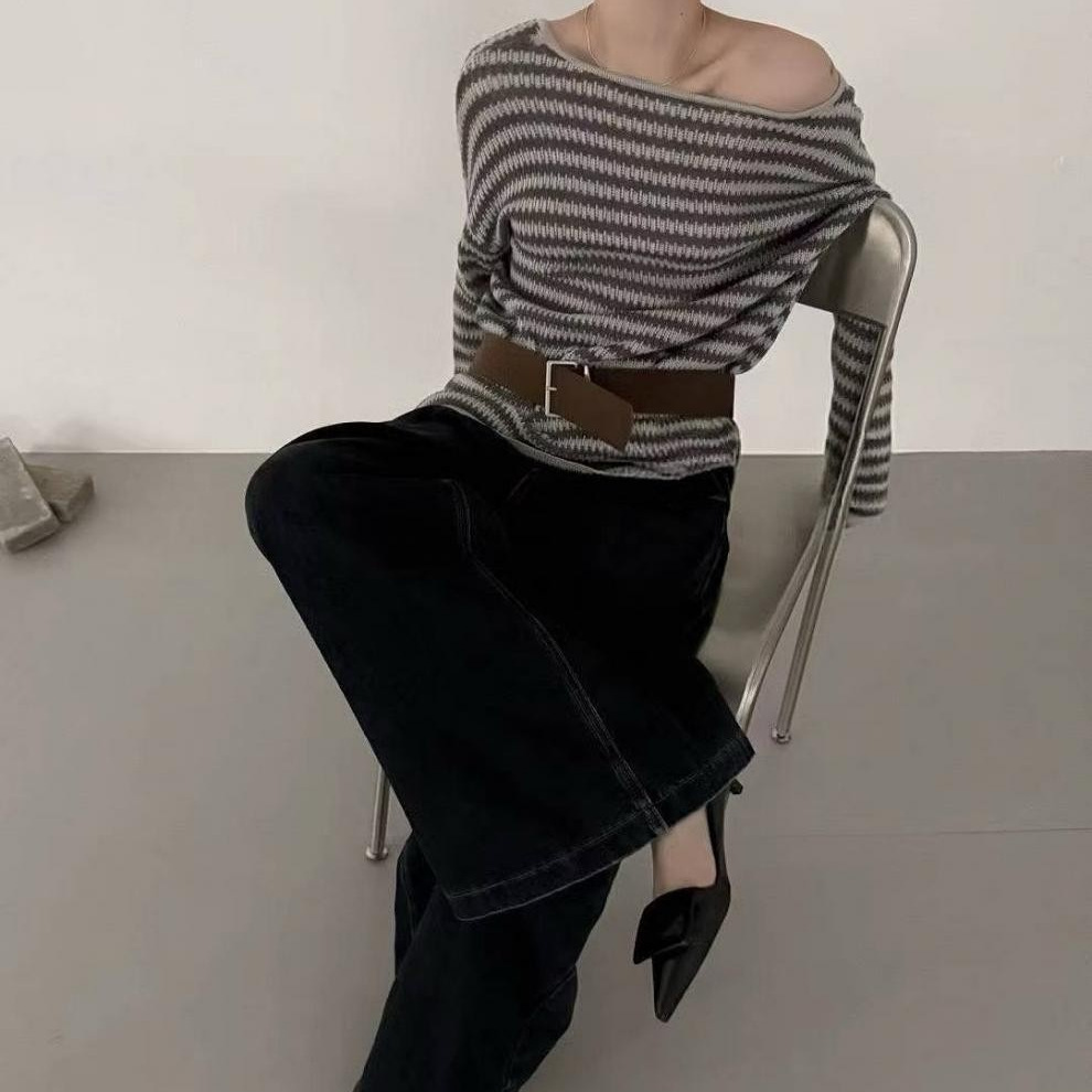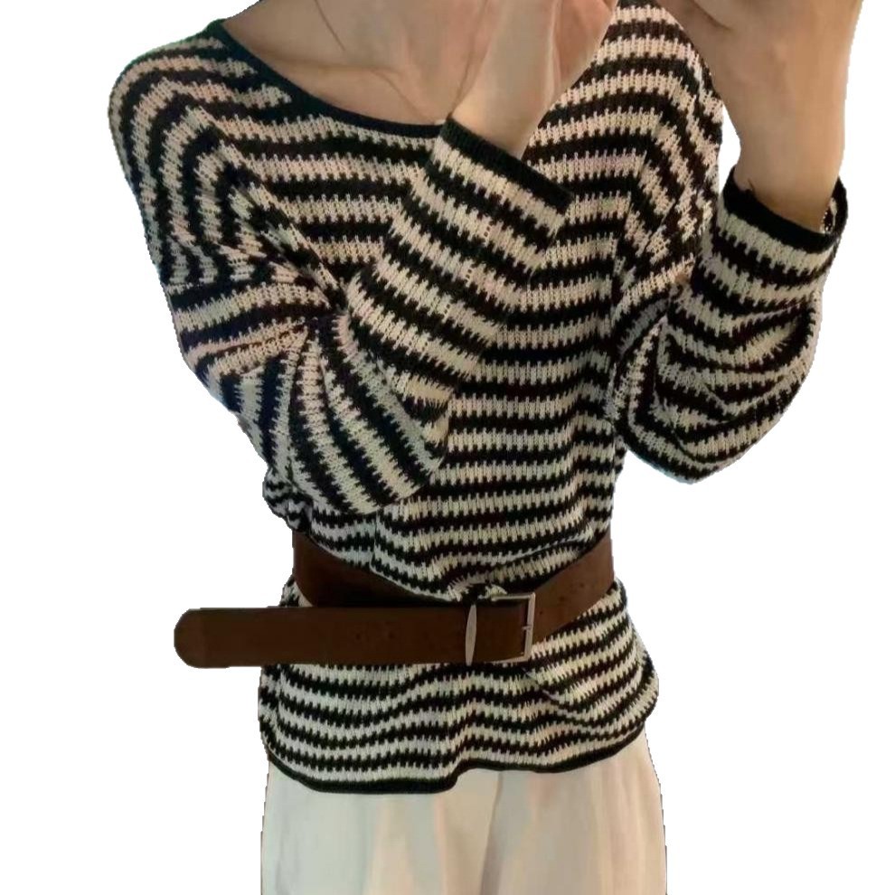 2025新款女装秋上新套头宽松时尚条纹针织衫配腰带长袖