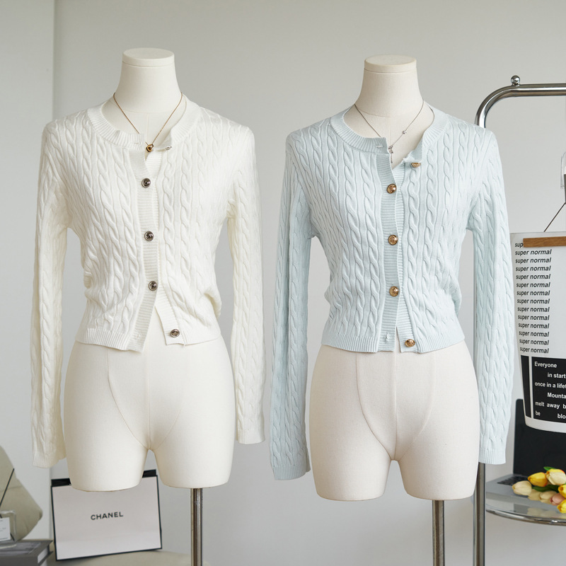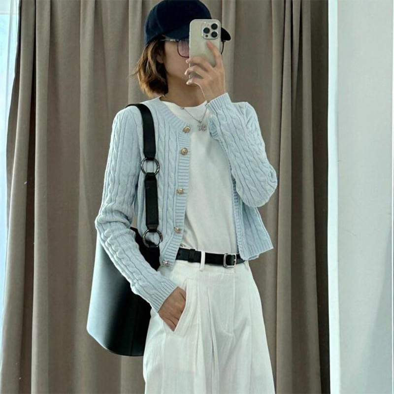 复古短袖麻花圆领针织开衫2025秋季软糯纯色慵懒风长袖毛衣外套