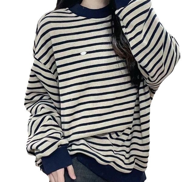 卫衣女2025秋冬韩版休闲简约条纹春秋薄款宽松大码圆领长袖上衣潮