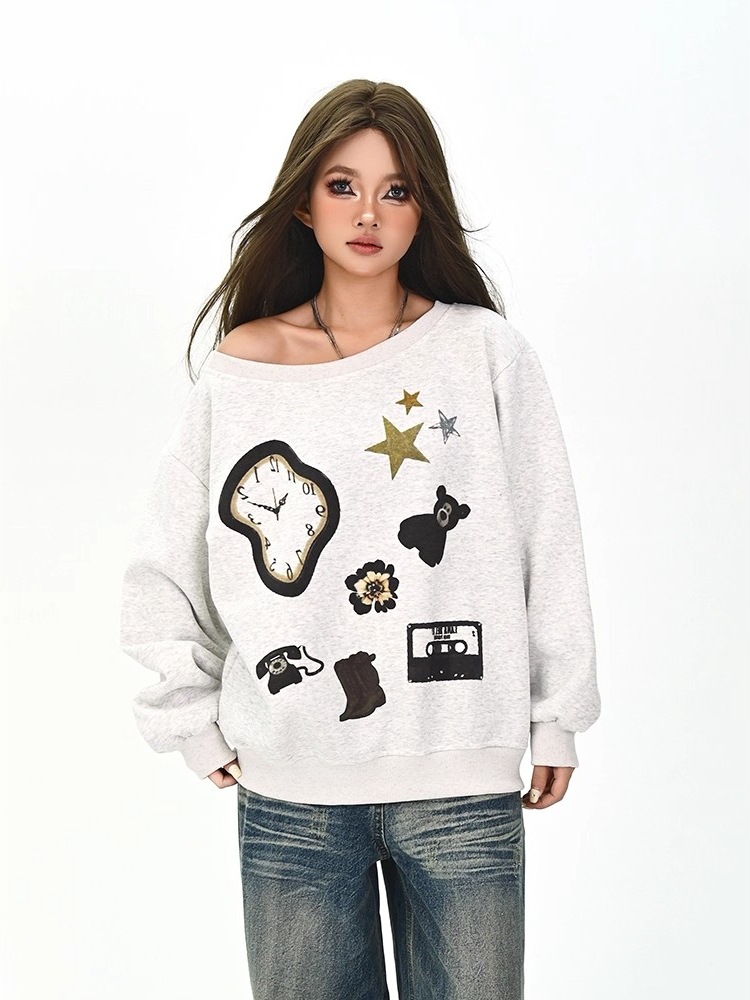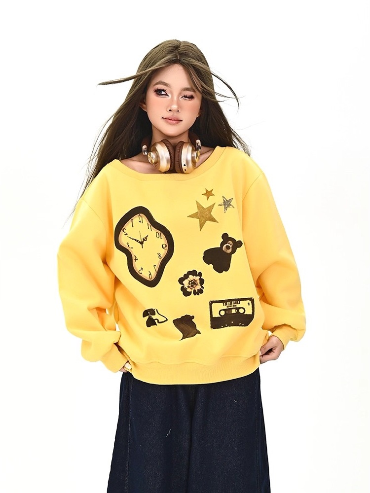 曼巴棉灰色趣味卡通斜肩卫衣女秋季新款宽松美式学院风上衣黄色
