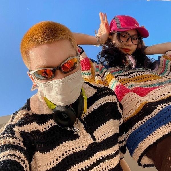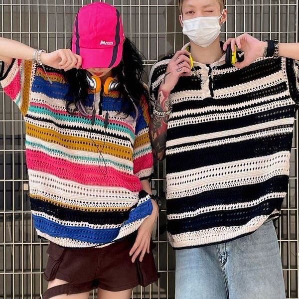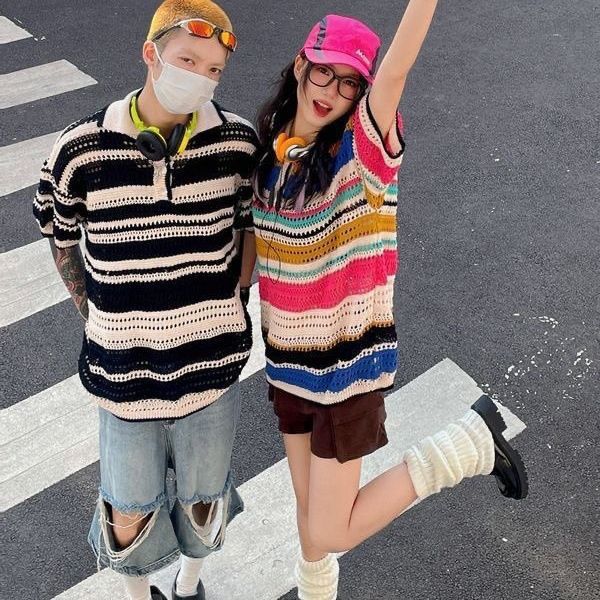 美式复古彩色条纹镂空针织衫T恤短袖男女新款宽松休闲情侣衬衫