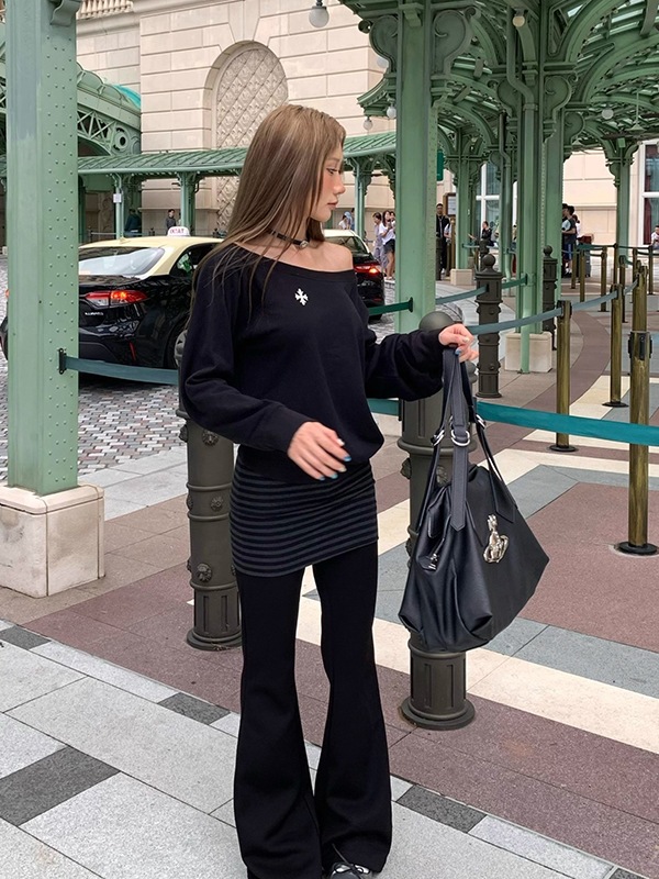 曼巴棉美式复古斜肩卫衣女秋季新款宽松露肩上衣白色灰色黑色