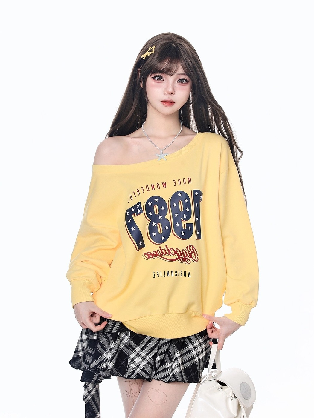 曼巴棉#美式复古字母印花斜肩卫衣女秋季新款宽松显瘦露肩上衣