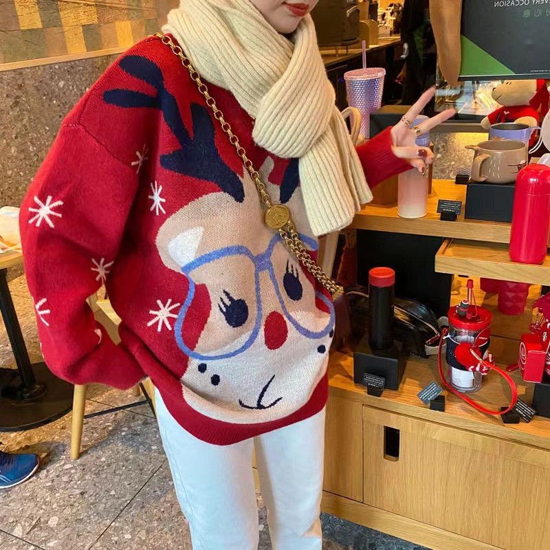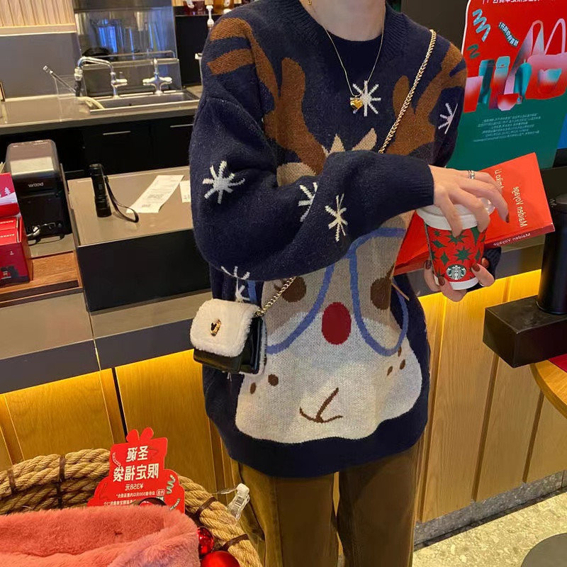 拼接跨境2025圆领毛衣冬季宽松慵懒风新款长袖