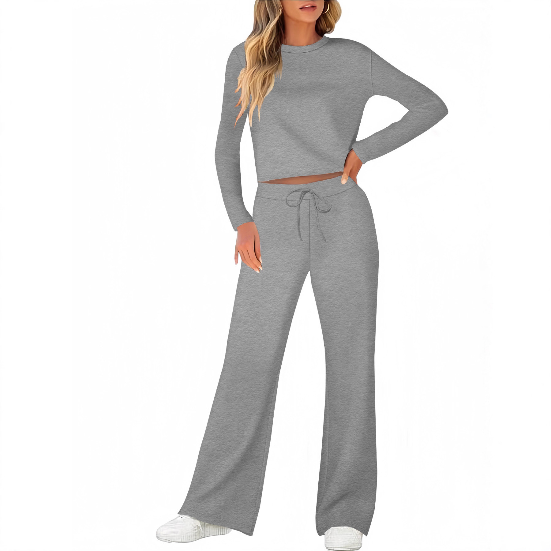 亚马逊新款欧美时尚套装纯色T恤长裤两件套装 圆领长袖长裤套装