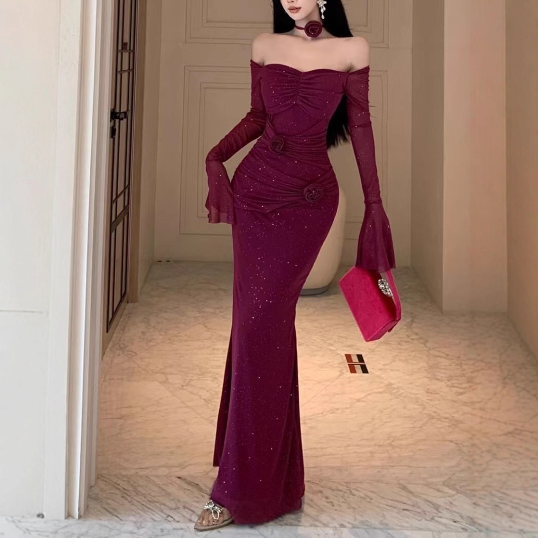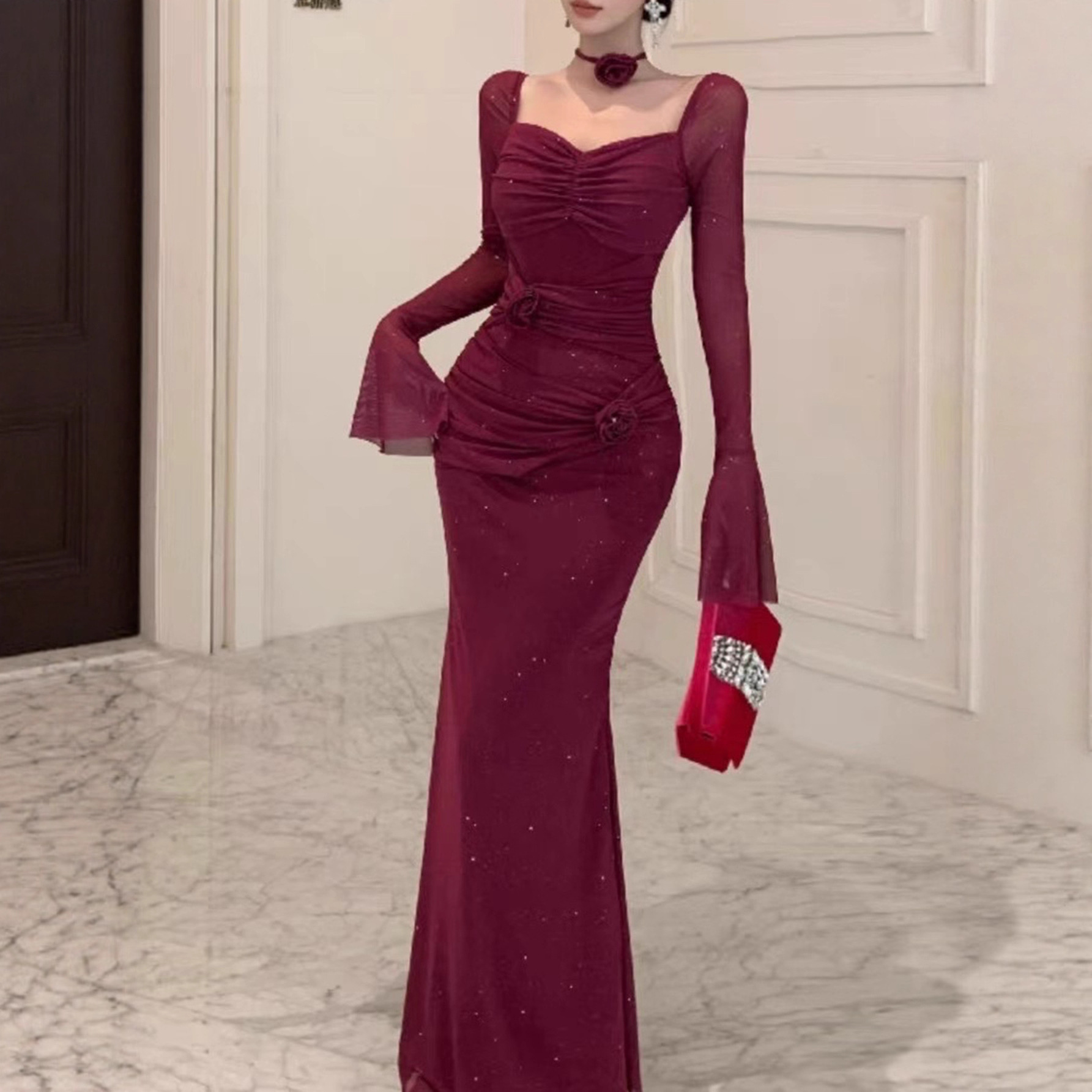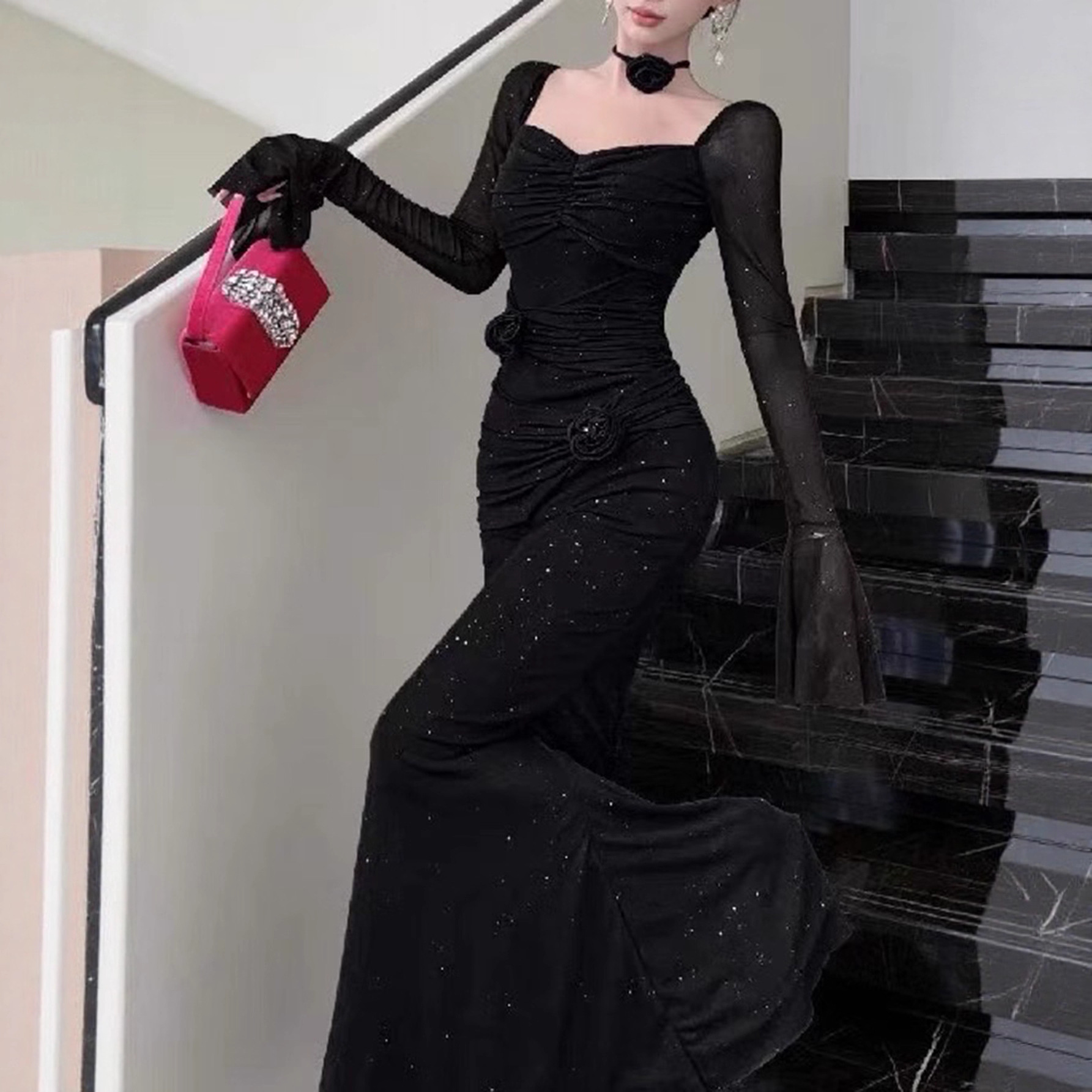 高级感法式重工3D立体花朵修身圆领喇叭长袖连衣裙女春秋季收腰气