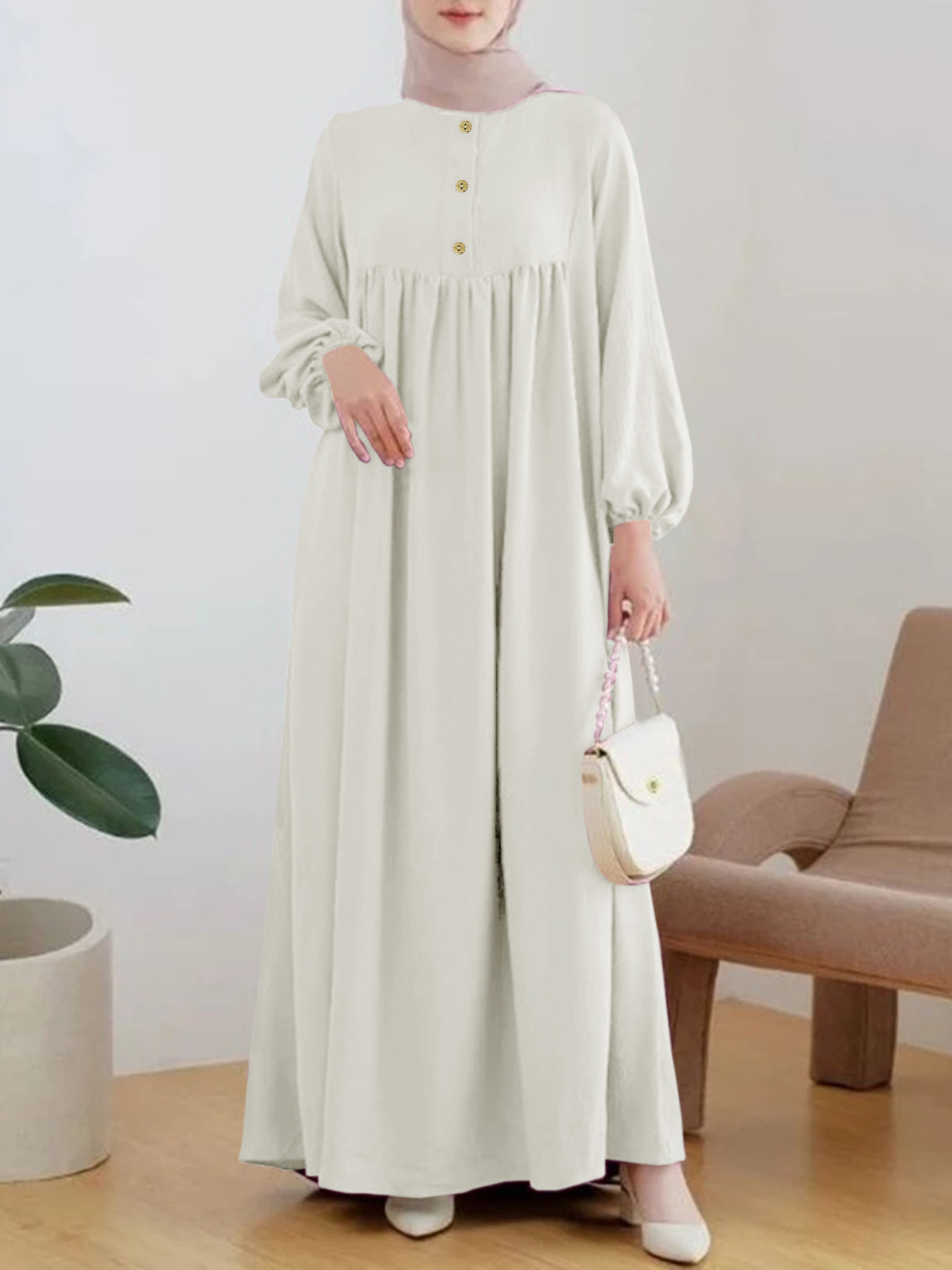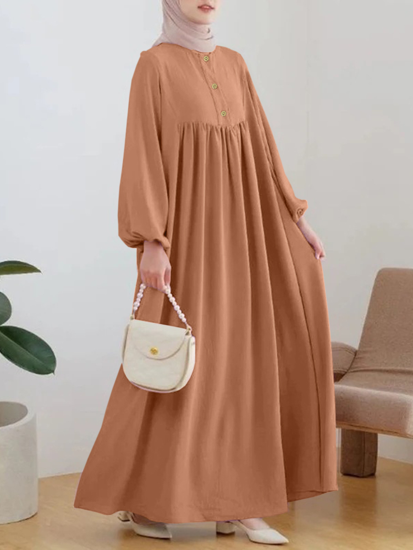 2025春夏新款中东穆斯林女长袍时尚休闲泡泡袖简约宽松纯色连衣裙