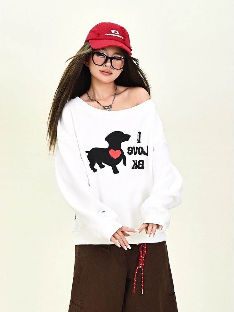 曼巴棉白色爱心小狗斜肩卫衣女秋季新款宽松美式辣妹上衣