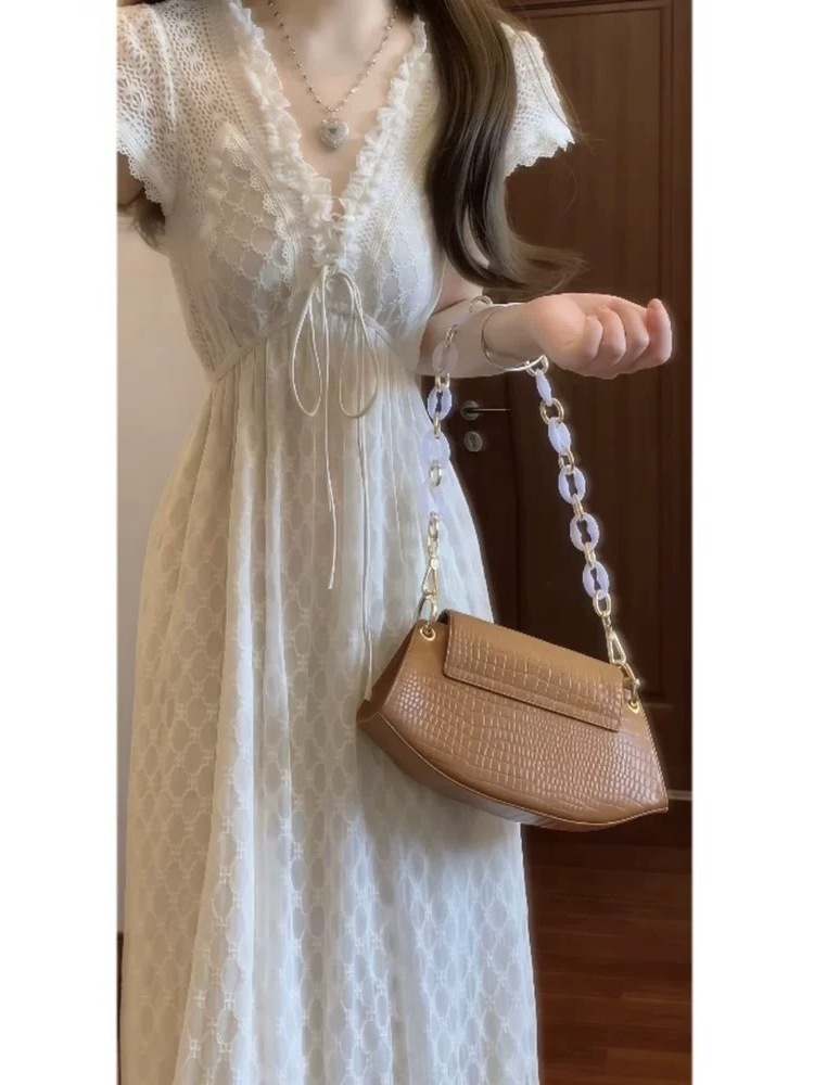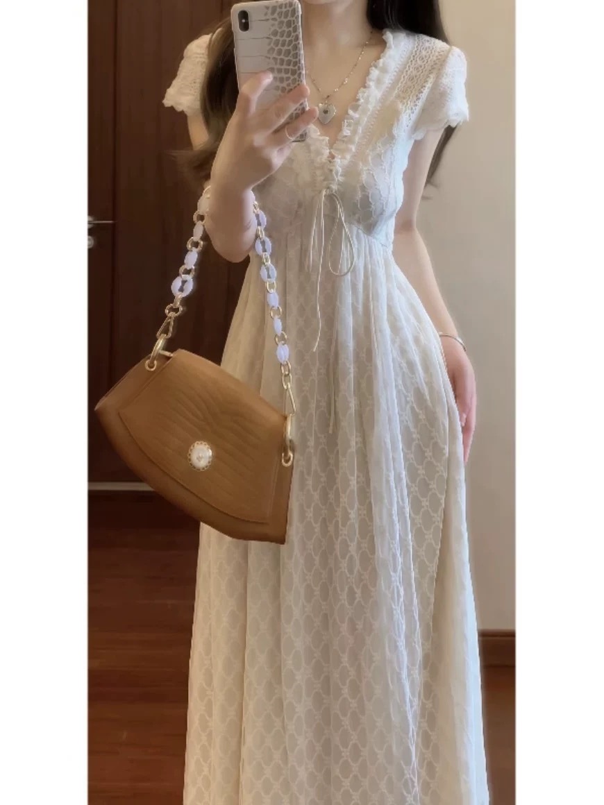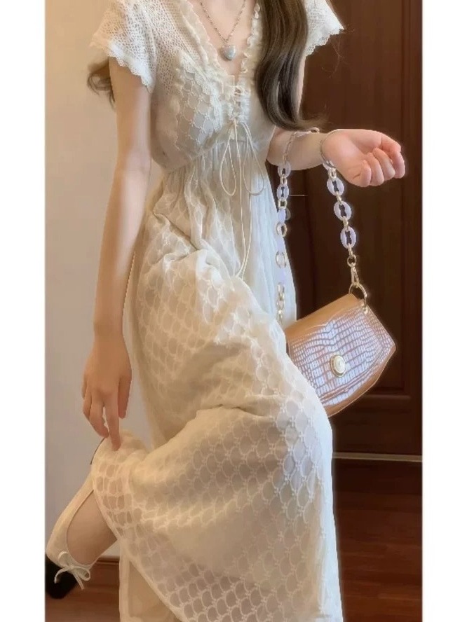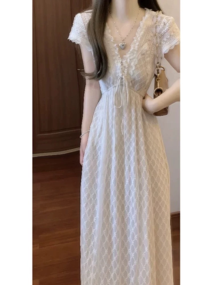 法式温柔重工手作蕾丝领气质连衣裙收腰显瘦度假风仙女长裙