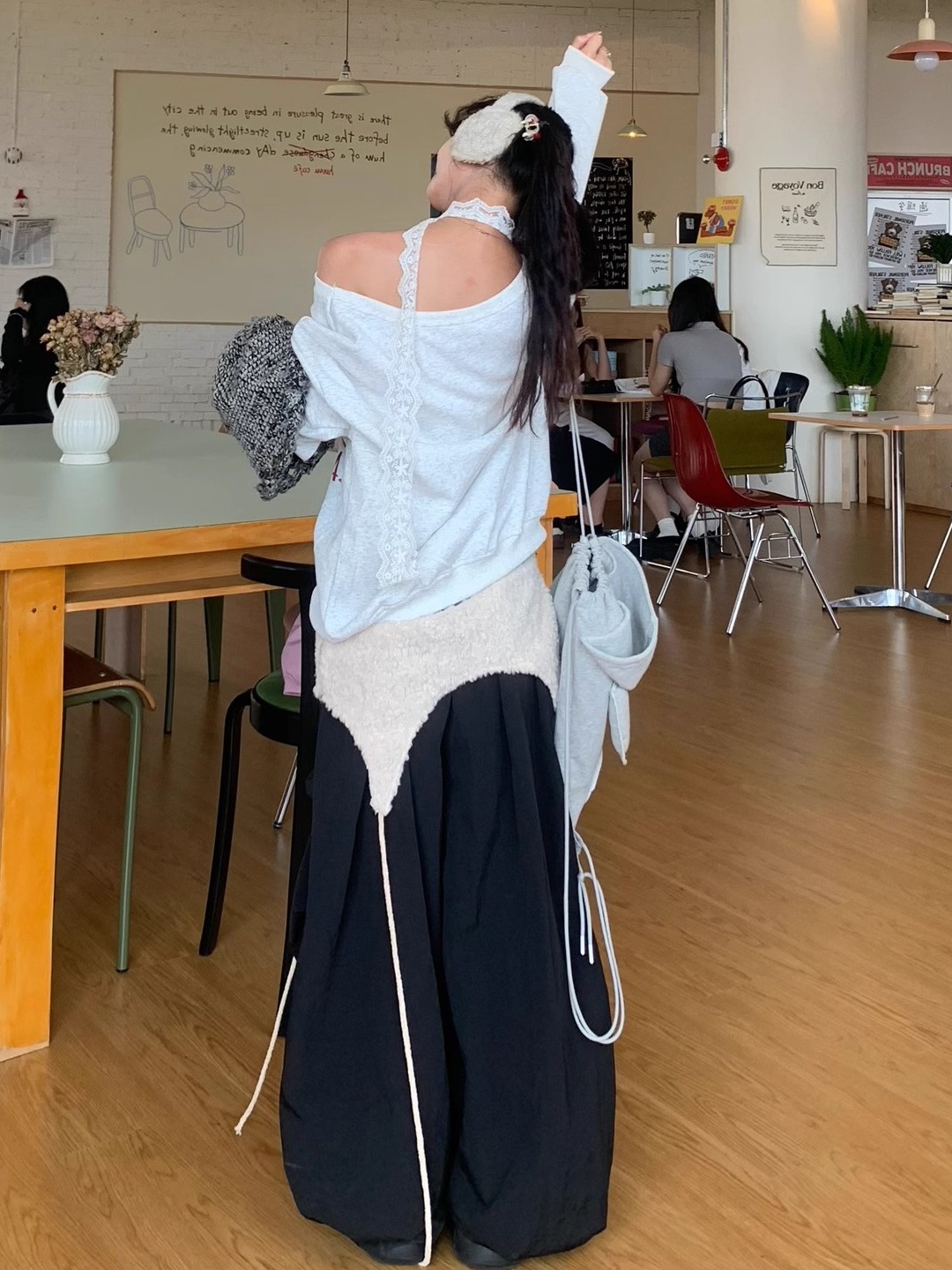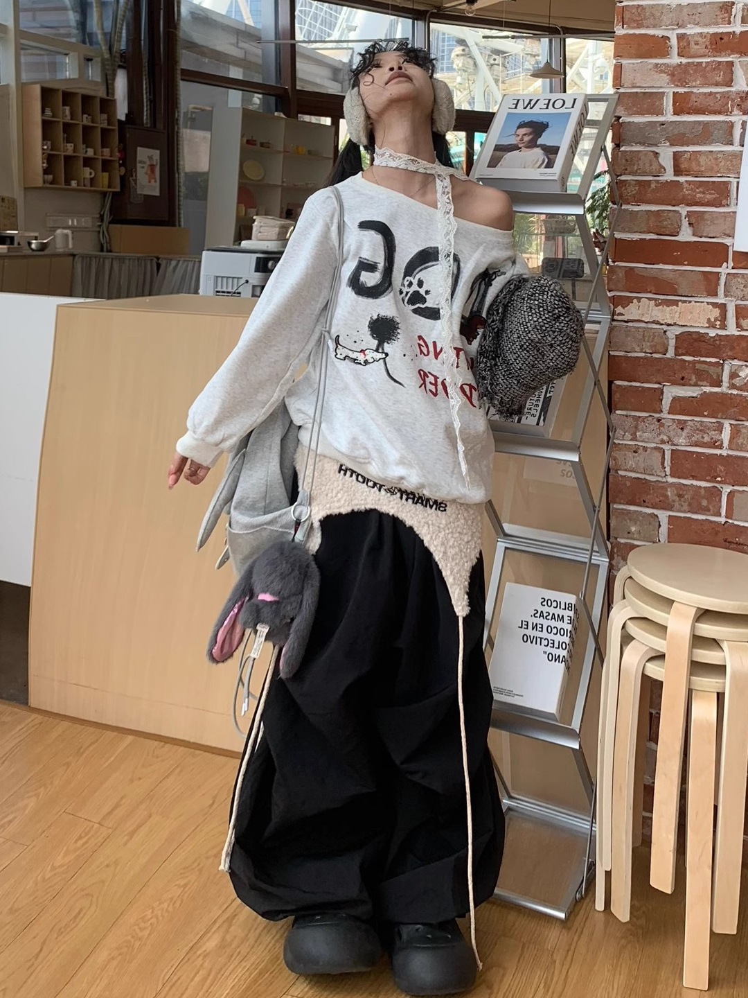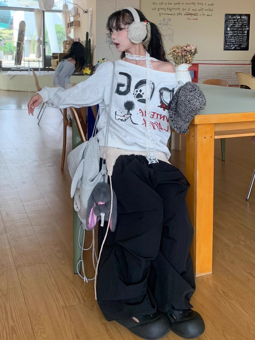 曼巴棉美式设计感印花斜肩卫衣女秋季新款宽松显瘦露肩上衣浅灰色