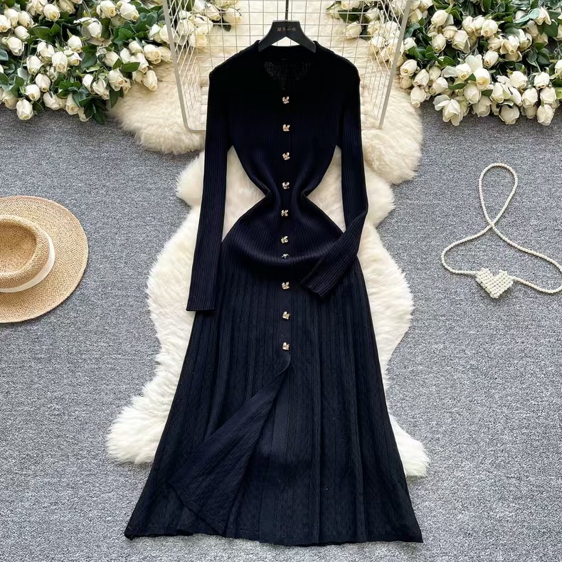 法式复古风高级感针织连衣裙女秋季荷叶边单排扣设计气质轻奢长裙