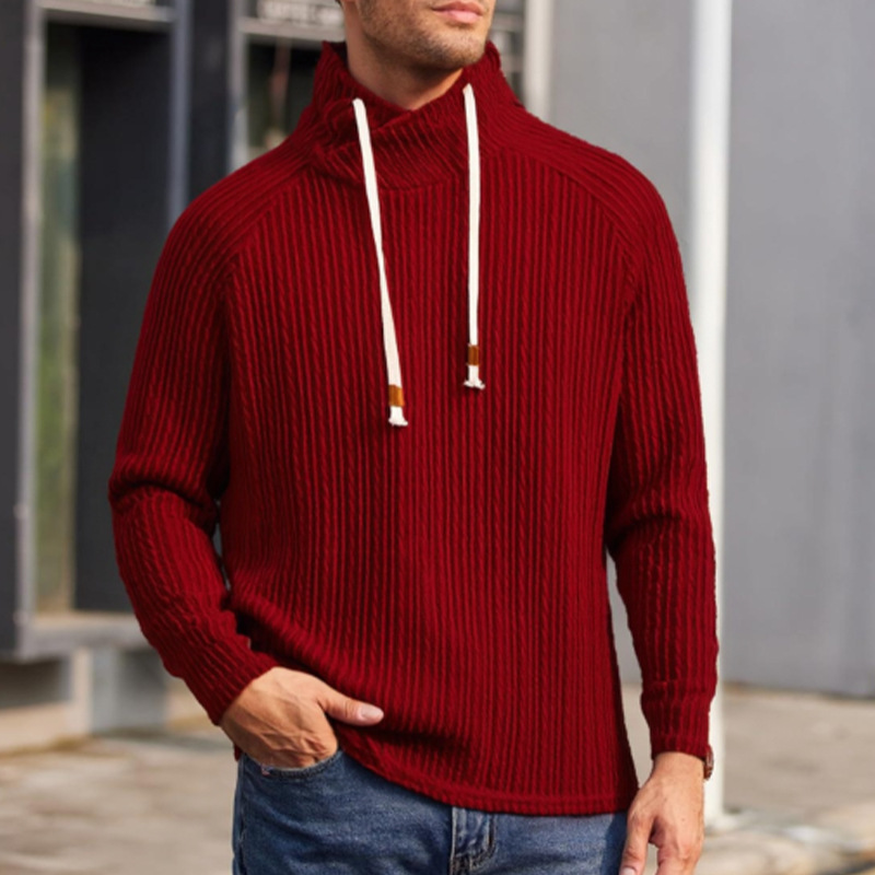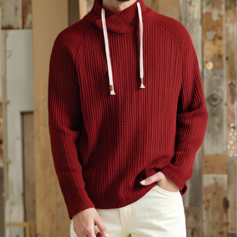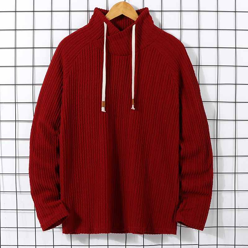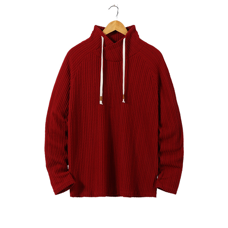 春秋款针织抽绳长袖针织衫美式时尚男装红色宽松休闲卫衣简约上衣
