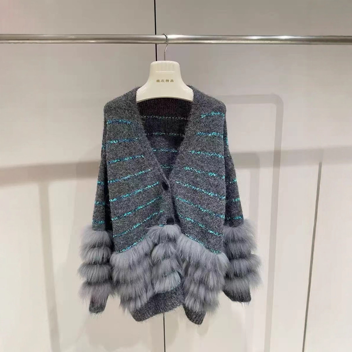 亚马逊跨境秋冬高级感狐狸毛亮丝条纹韩系长款宽松显瘦针织外套慵
