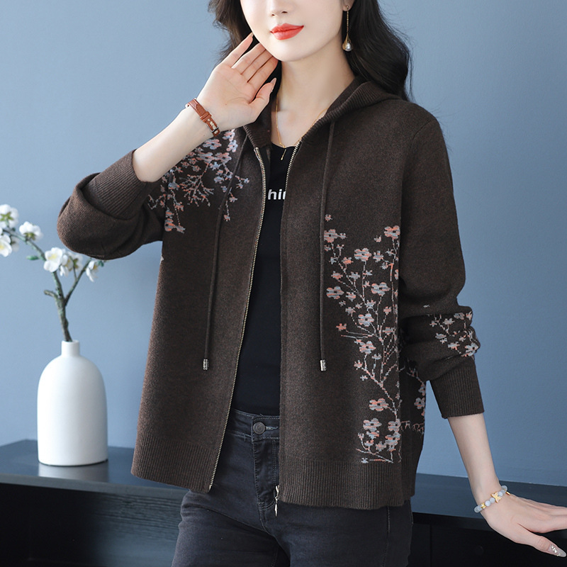 2025年新款休闲减龄妈妈连帽针织上衣开衫宽松大码提花毛衣外套