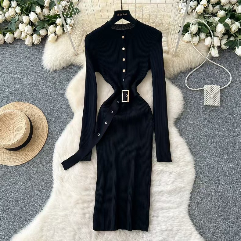 极简风高级感针织长袖连衣裙女秋季腰带显瘦修身轻熟御姐气质长裙