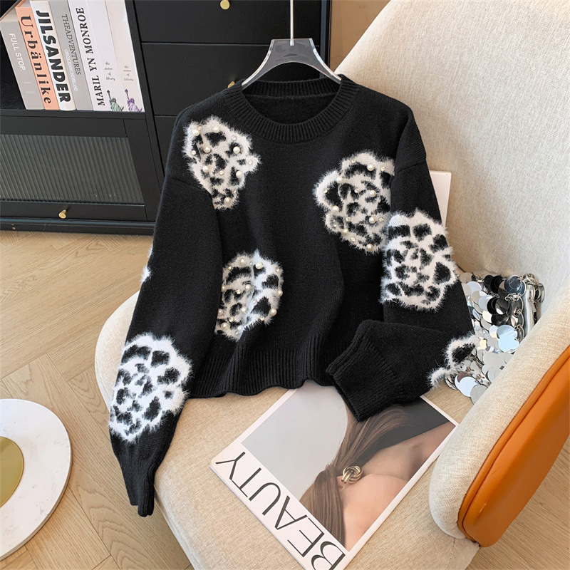 2025秋冬新款潮流圆领钉珠针织毛衣女宽松提花山茶花套头上衣