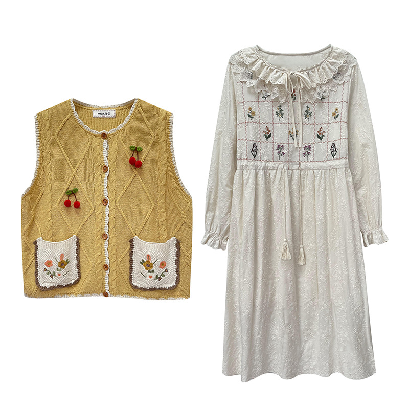 法式复古黄色马甲双层领刺绣连衣裙两件套女气质收腰娃娃裙套装