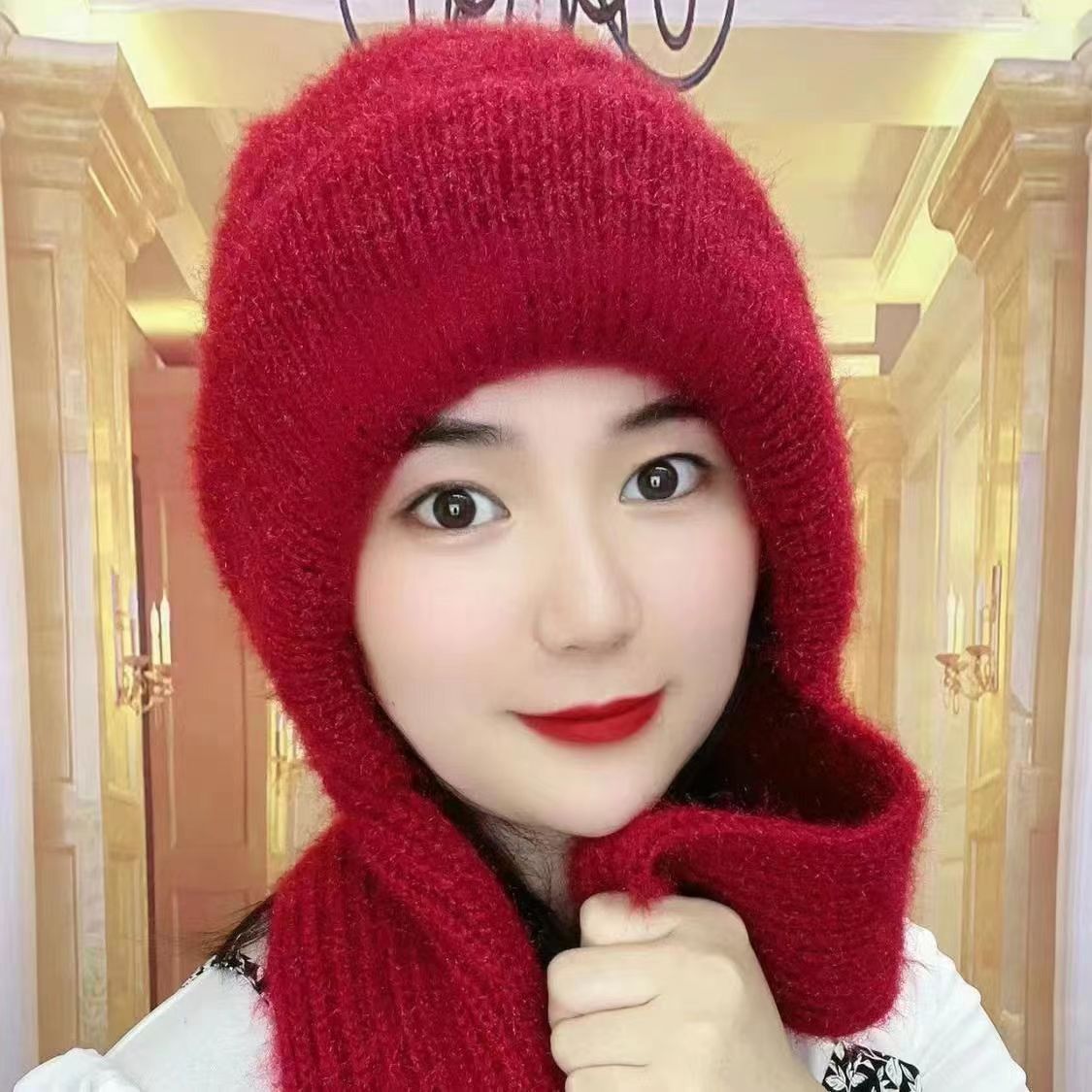 秋冬款松鼠绒保暖女毛线帽百搭风雪帽防寒冬季帽子围巾一体针织帽