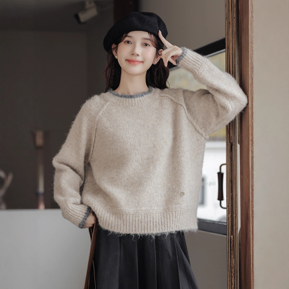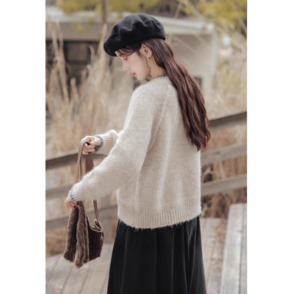 宽松撞色圆领设计感针织衫上衣外套女秋慵懒韩系百搭气质软糯毛衣