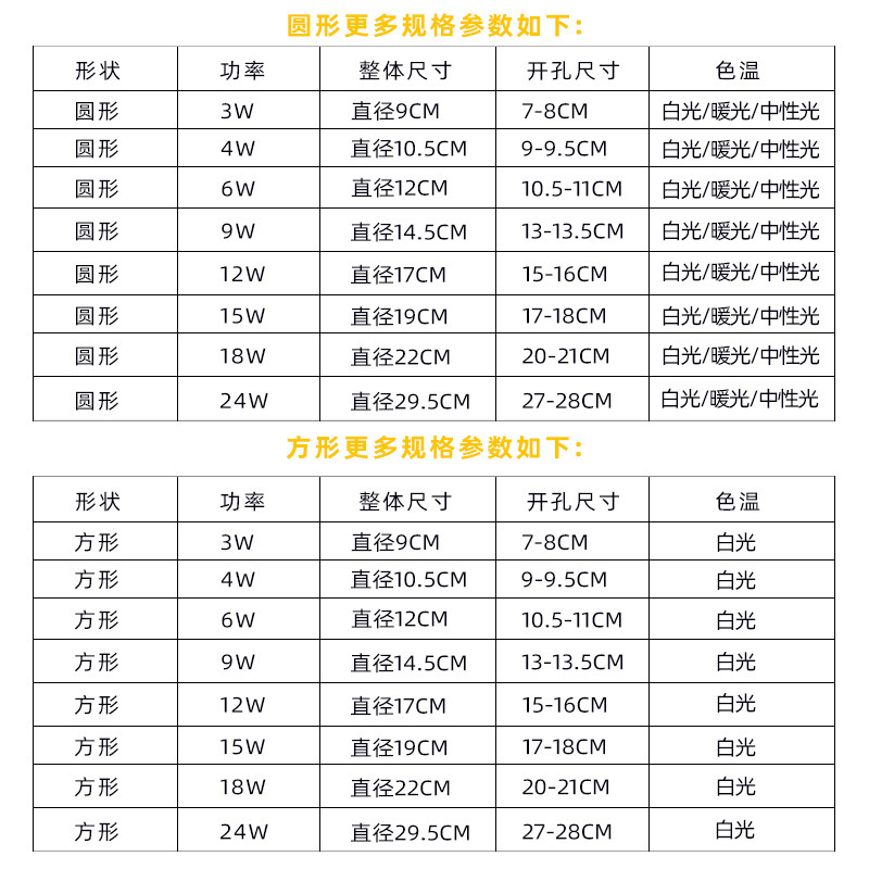 灯光颜色 | 方形24W白光-开孔27-28.5CM | 灯光颜色 | 高档超亮圆形白光15W-开孔17-18CM |