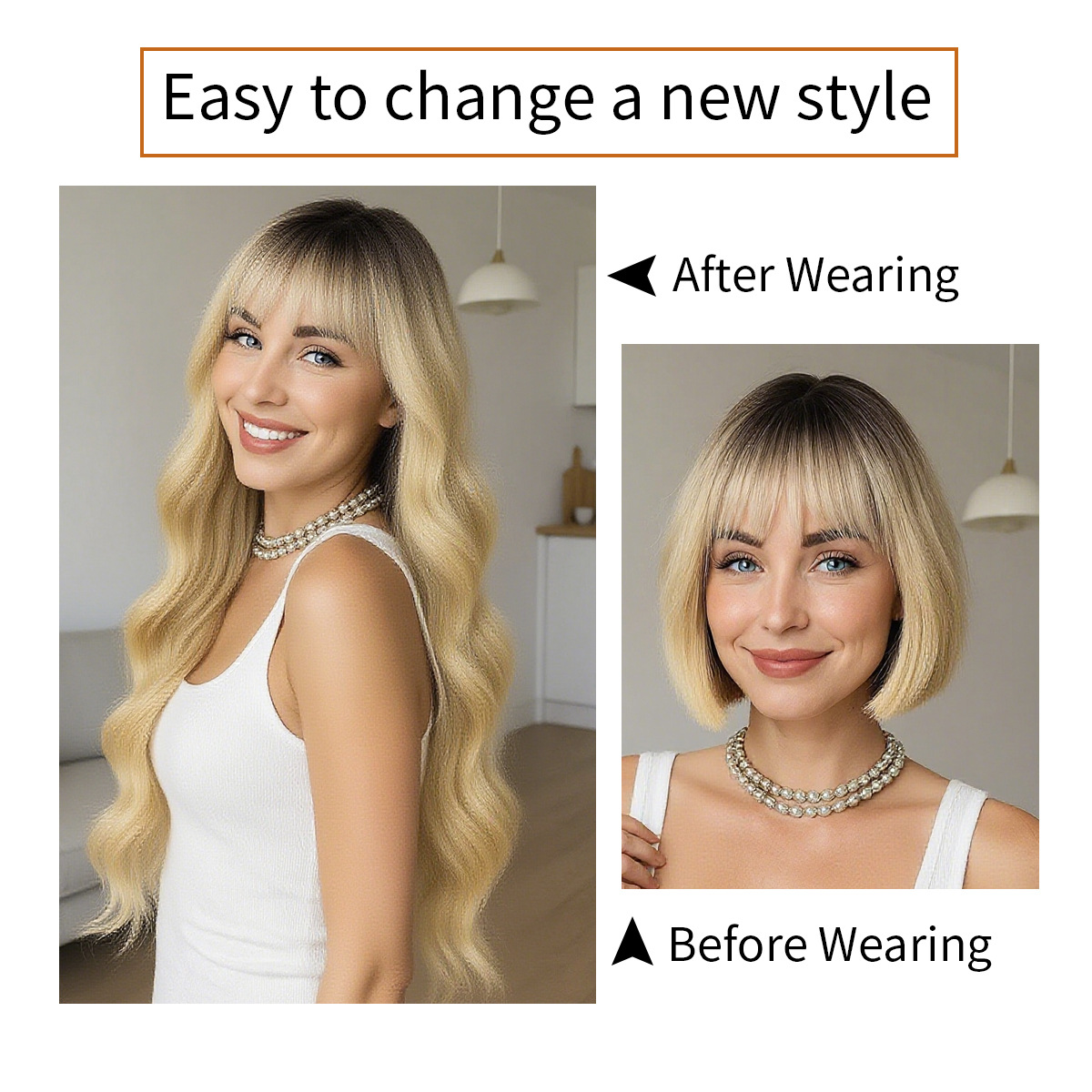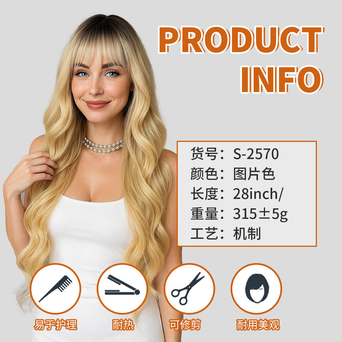 跨境假发女金色渐变大波浪长卷发自然齐刘海化纤全头套厂家批发