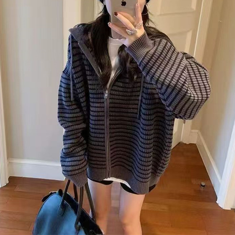 2025冬季新款宽松休闲连帽慵懒风毛衣外套上衣条纹拉链针织开衫女