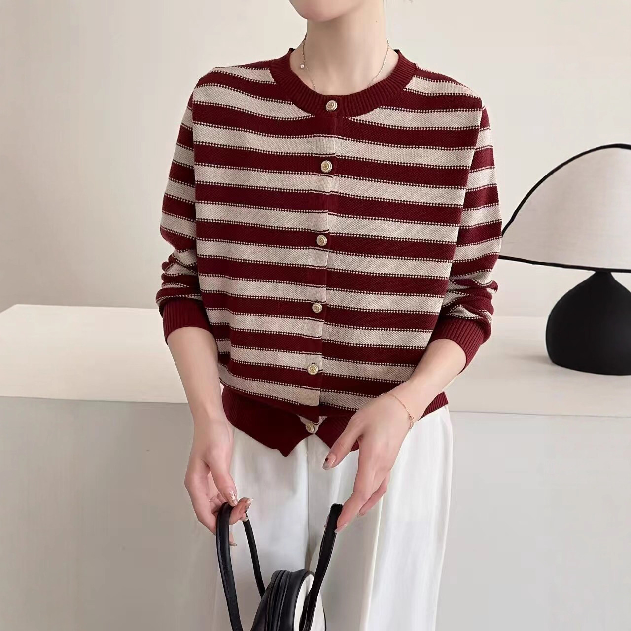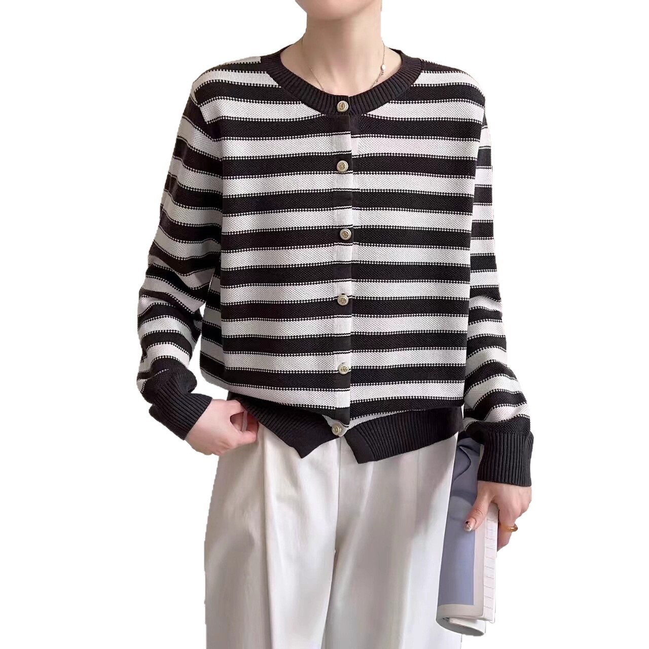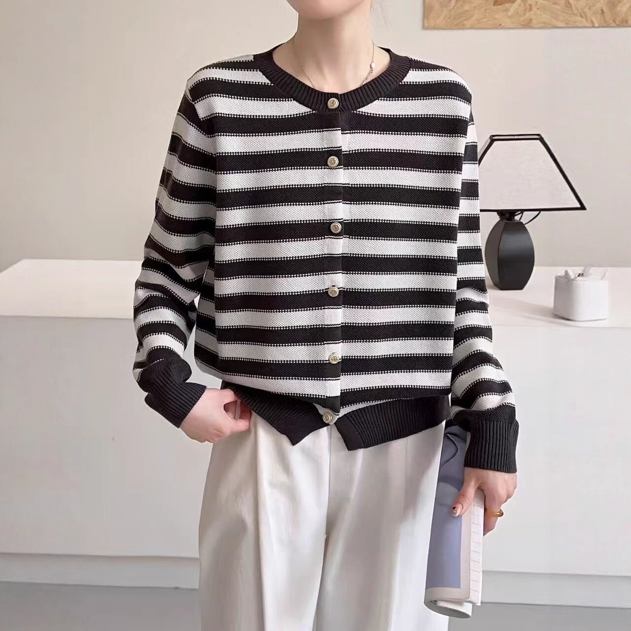 2025秋装新品韩系温柔拼色条纹针织衫开衫外套圆领针织衫
