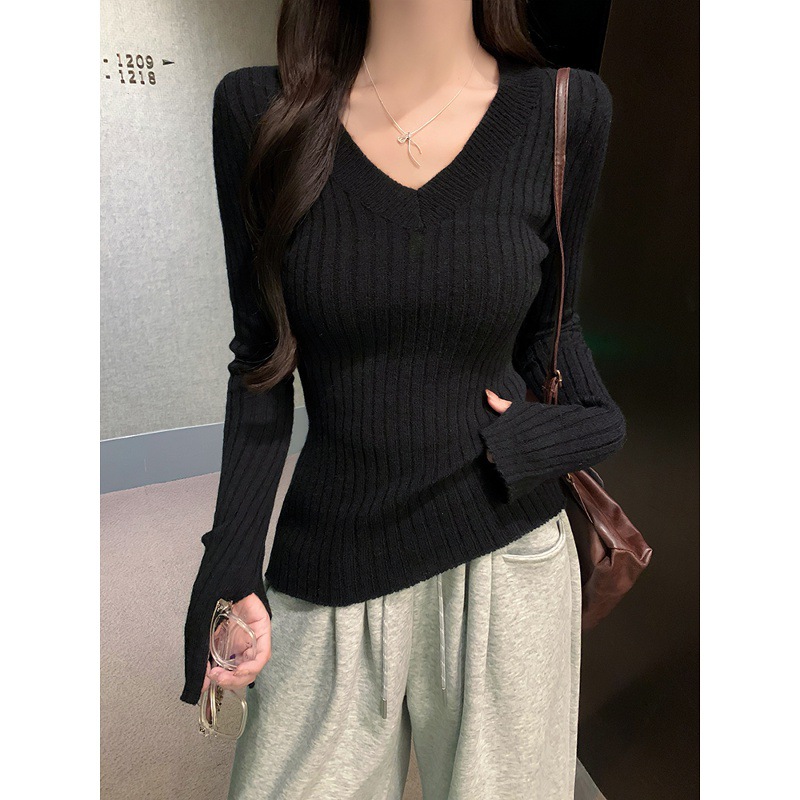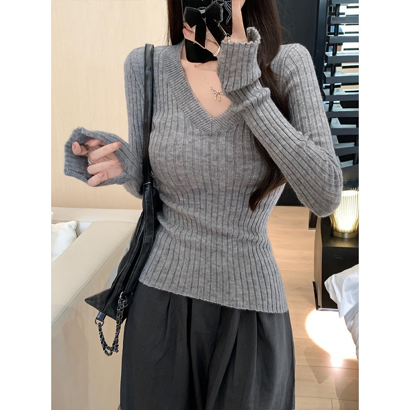 2025新款慵懒风灰色V领长袖针织衫女装秋季别致减龄修身显瘦上衣