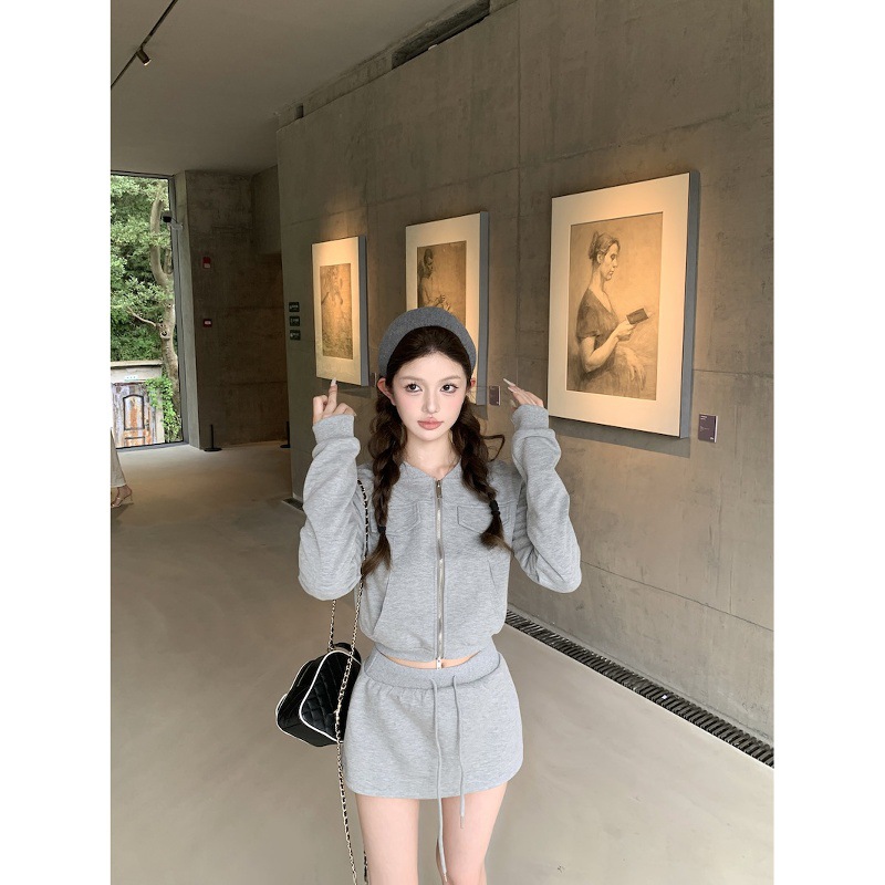 2025新款休闲套装灰色立领长袖外套女秋季抽绳半身裙A字裙两件套