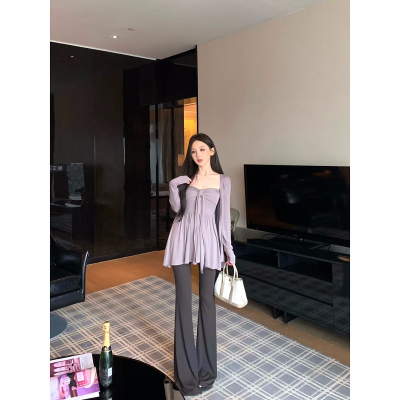 2025新款气质套装设计感飘带抹胸女开衫外套秋季垂感微喇裤三件套