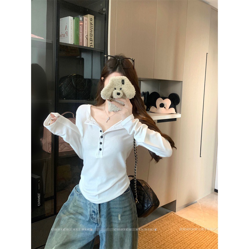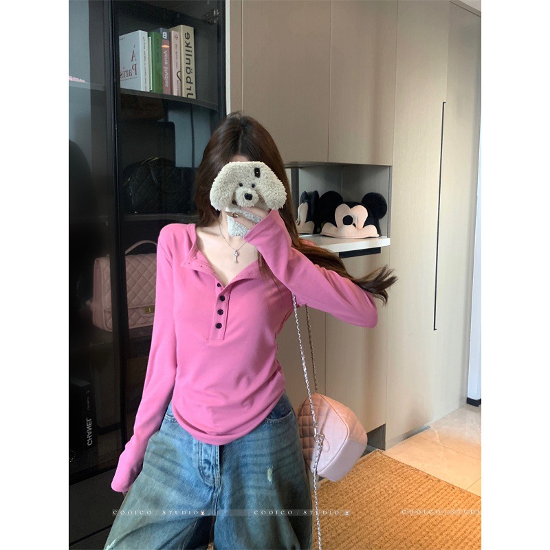 2025新款设计感纯色纽扣半开领长袖T恤女装秋季宽松百搭休闲上衣