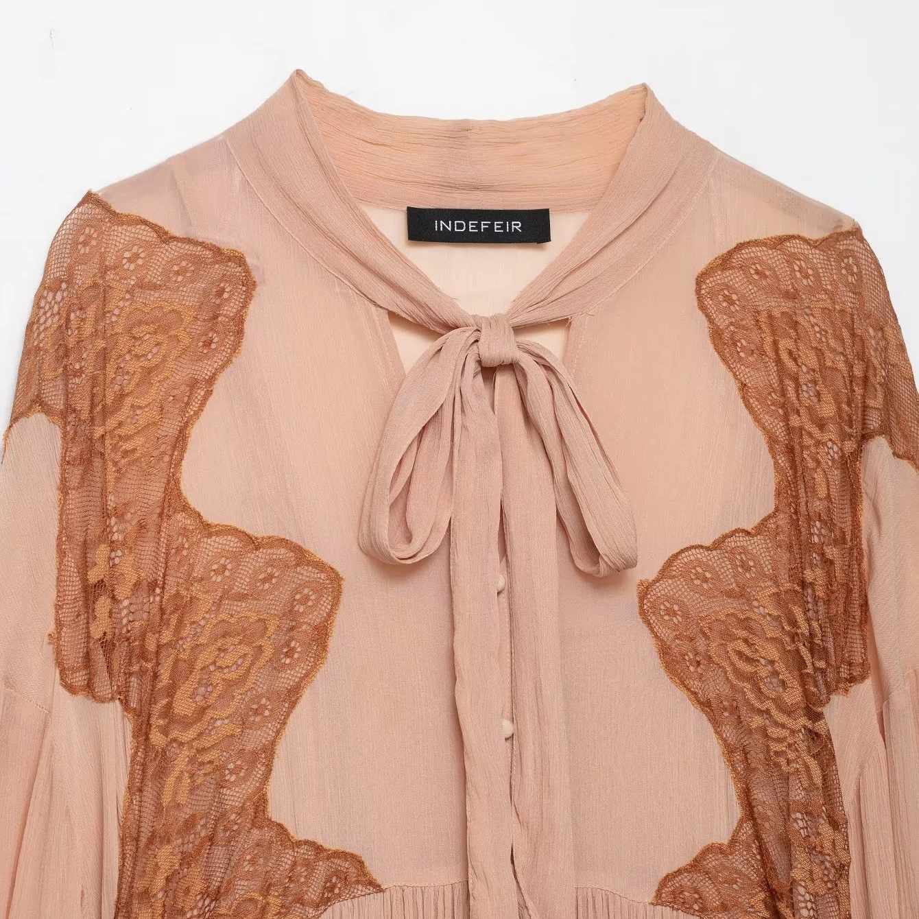 2025秋季新款欧美风时尚蝴蝶结拼接蕾丝复古长裙宽松长袖连衣裙