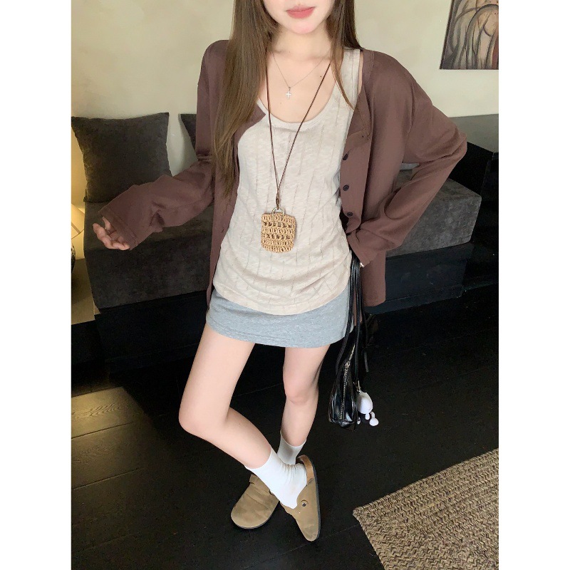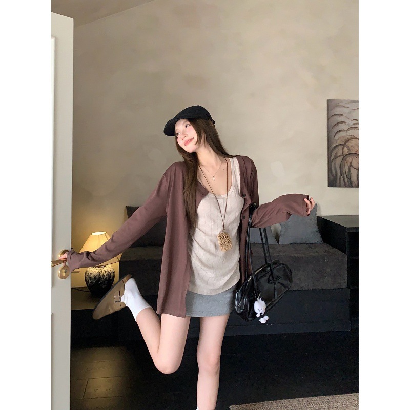 2025新款时尚套装宽松纯色长袖开衫女秋季内搭气质吊带背心两件套