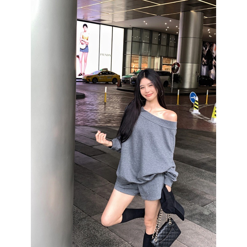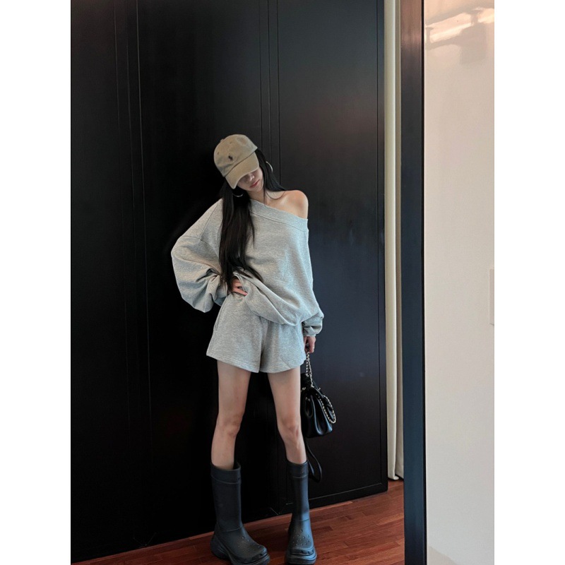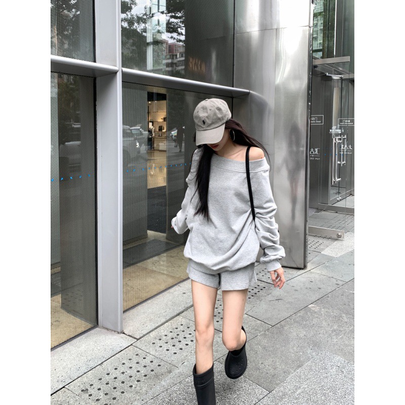 2025新款慵懒风浅灰色斜肩长袖卫衣女装秋季百搭休闲裤短裤两件套
