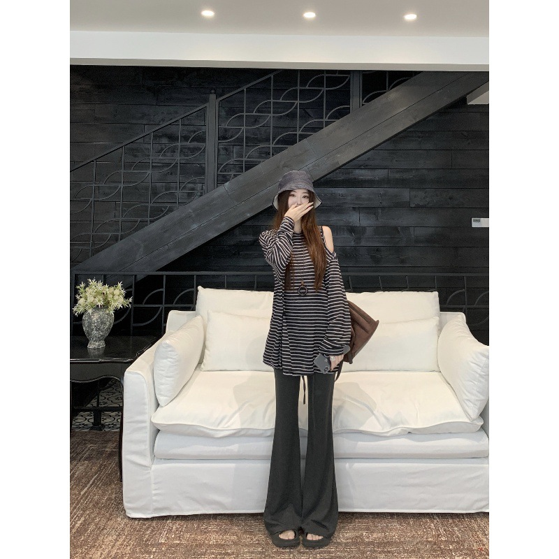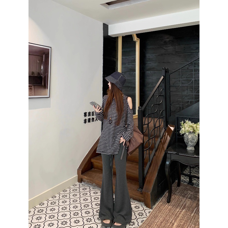 2025新款慵懒风条纹露肩长袖T恤女秋季修身显瘦休闲裤长裤两件套