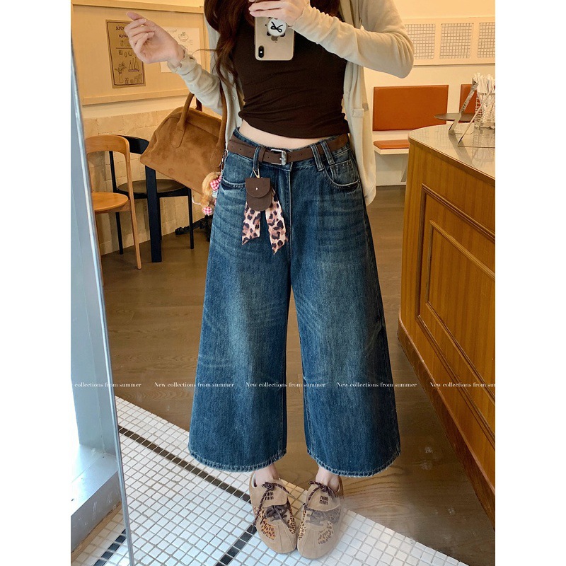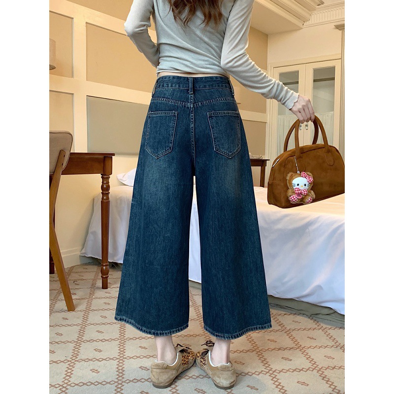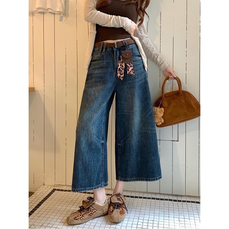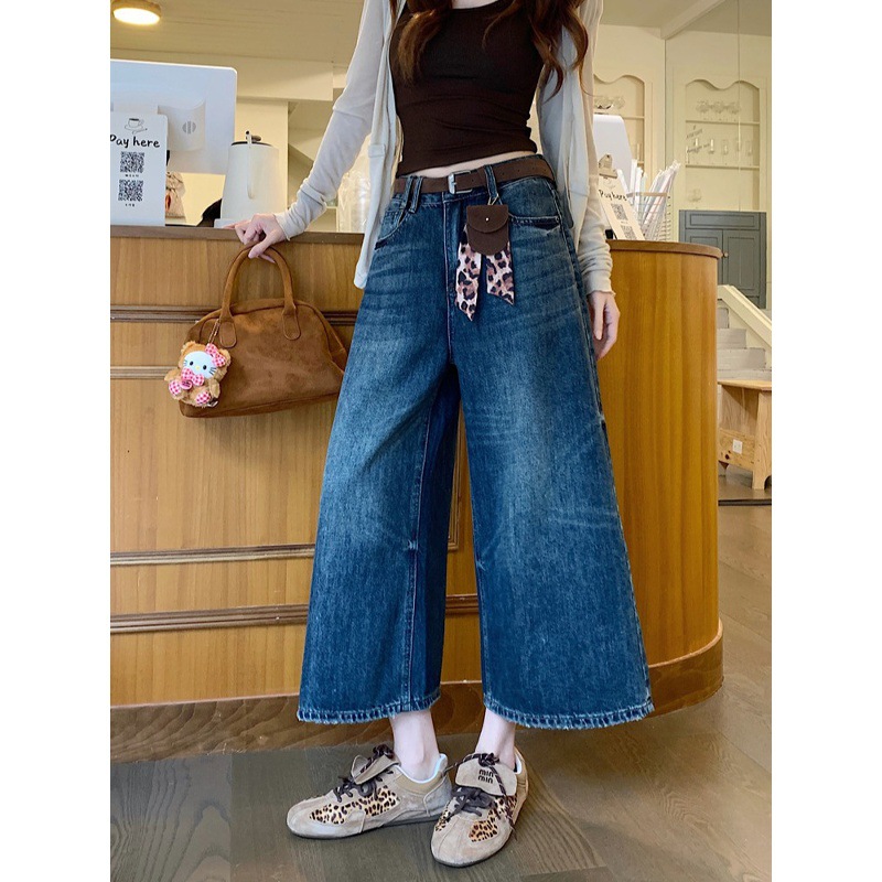 2025新款美式复古做旧水洗蓝色牛仔裤女秋季高腰显瘦阔腿裤七分裤