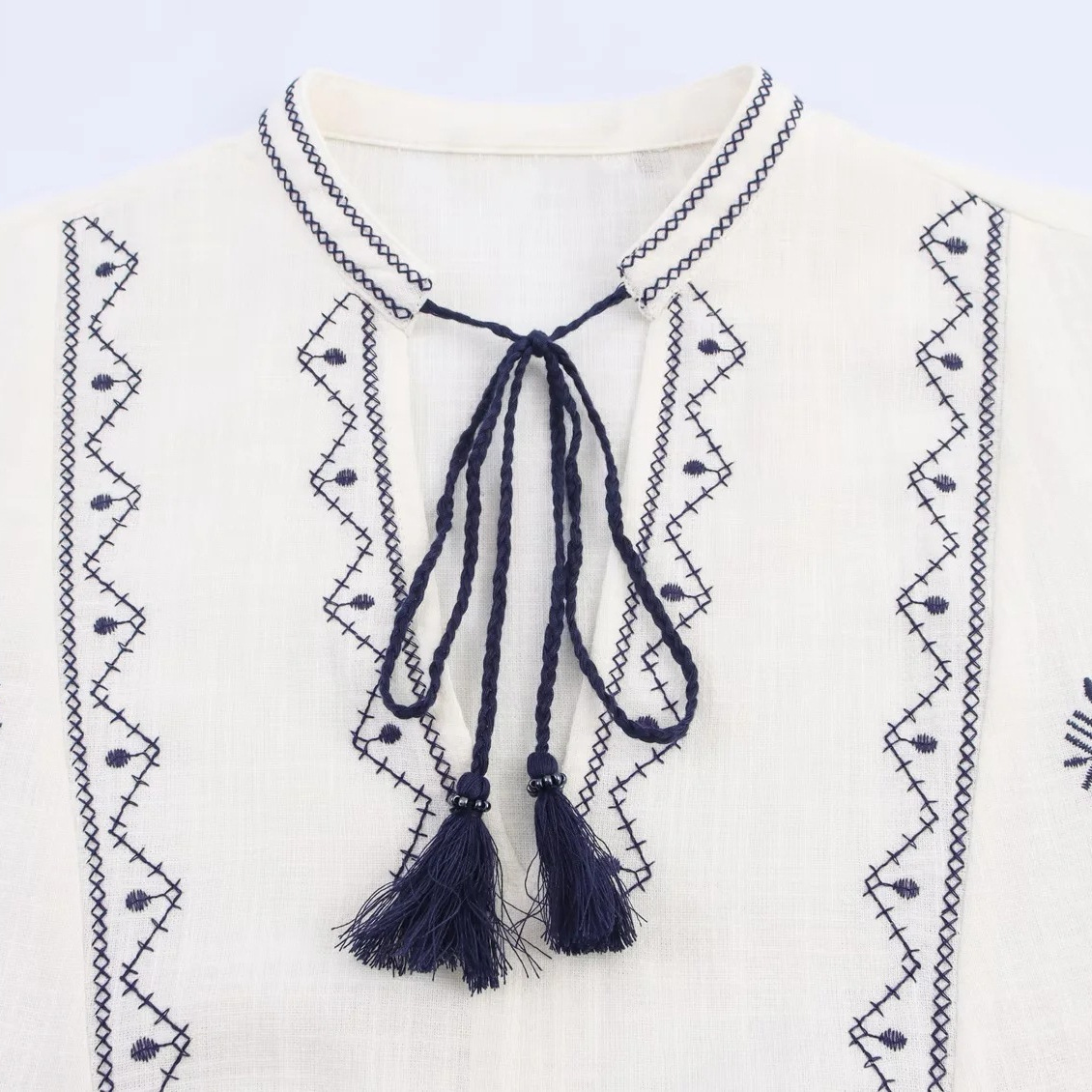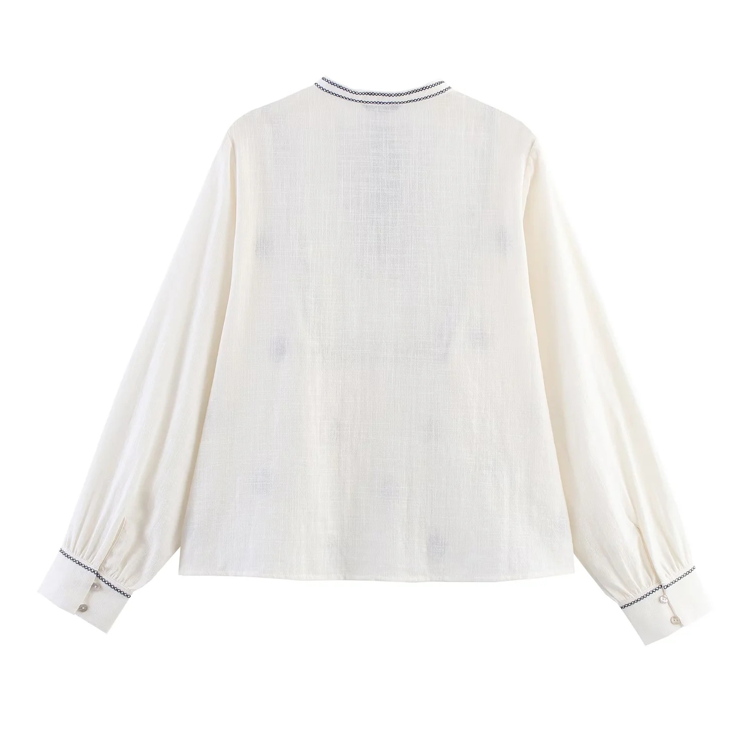 外贸女装2025秋季新款欧美风时尚百搭复古刺绣系带长袖衬衫上衣