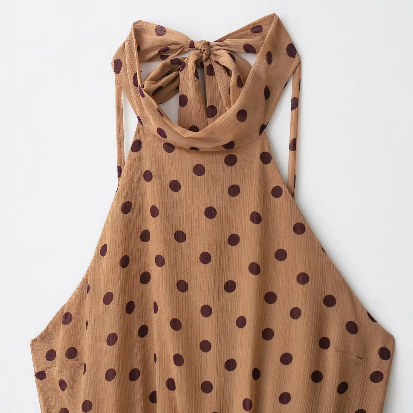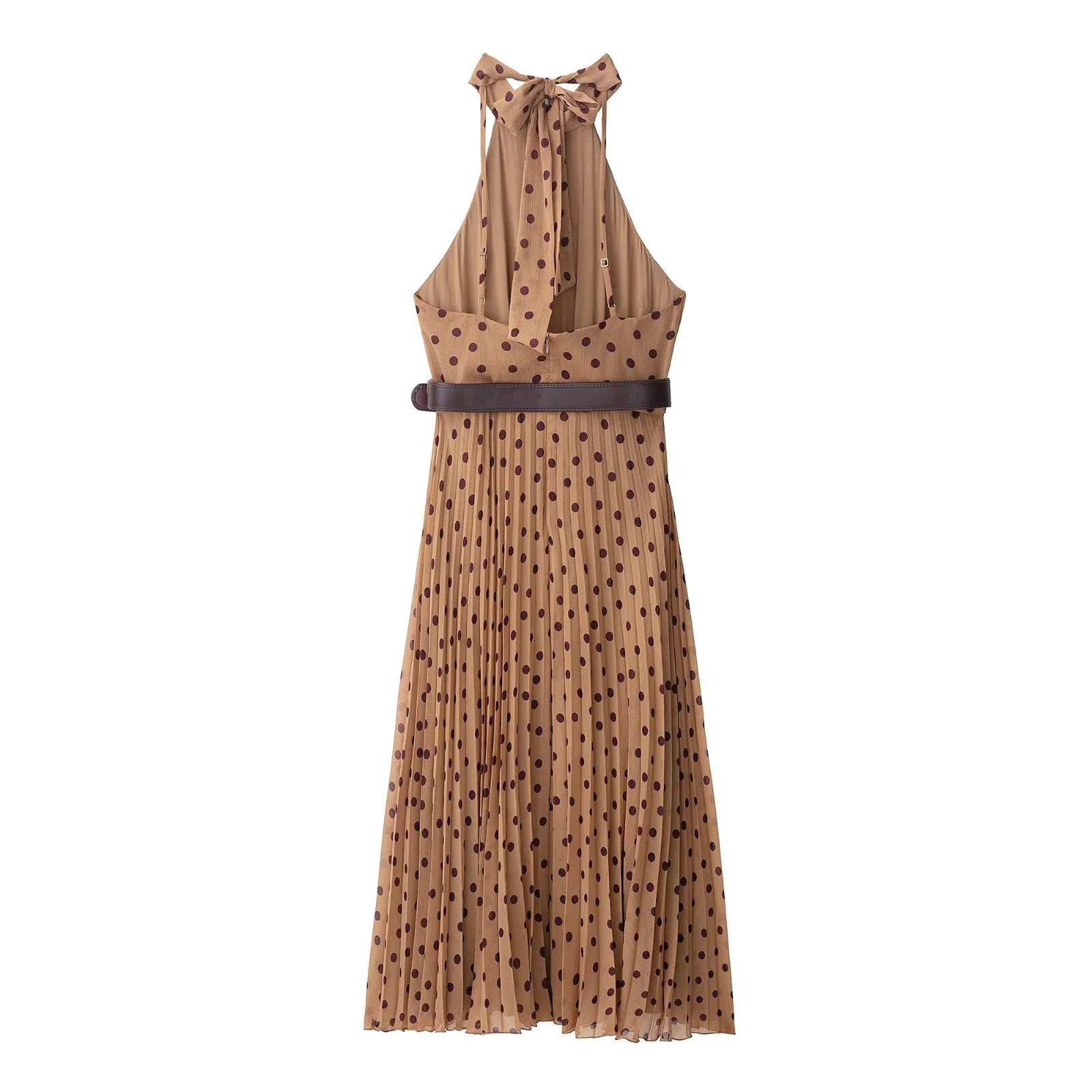 亚马逊跨境欧美风女装气质褶皱波点系腰带挂脖领无袖迷笛连衣裙