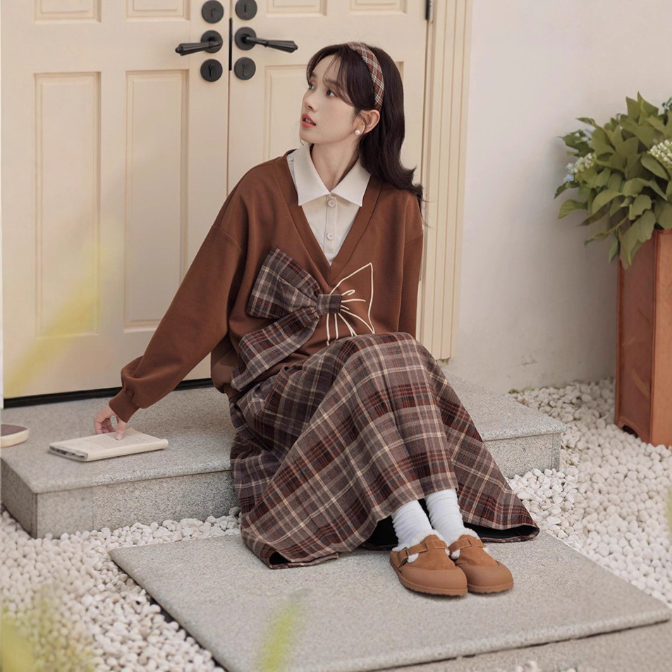学院风韩系穿搭两件套女设计感大蝴蝶结装饰卫衣格子半身裙套装